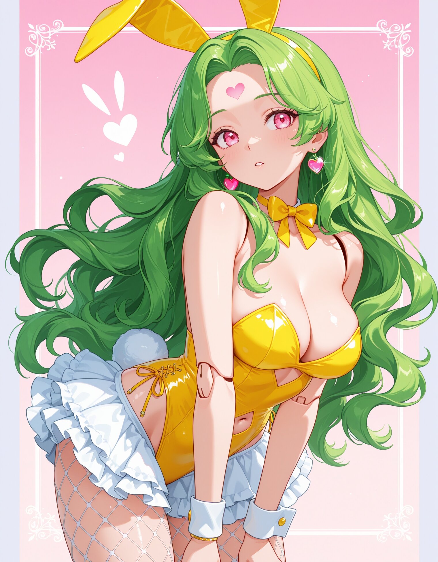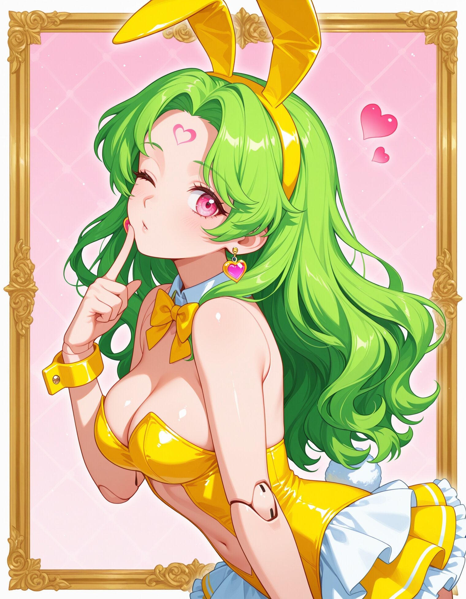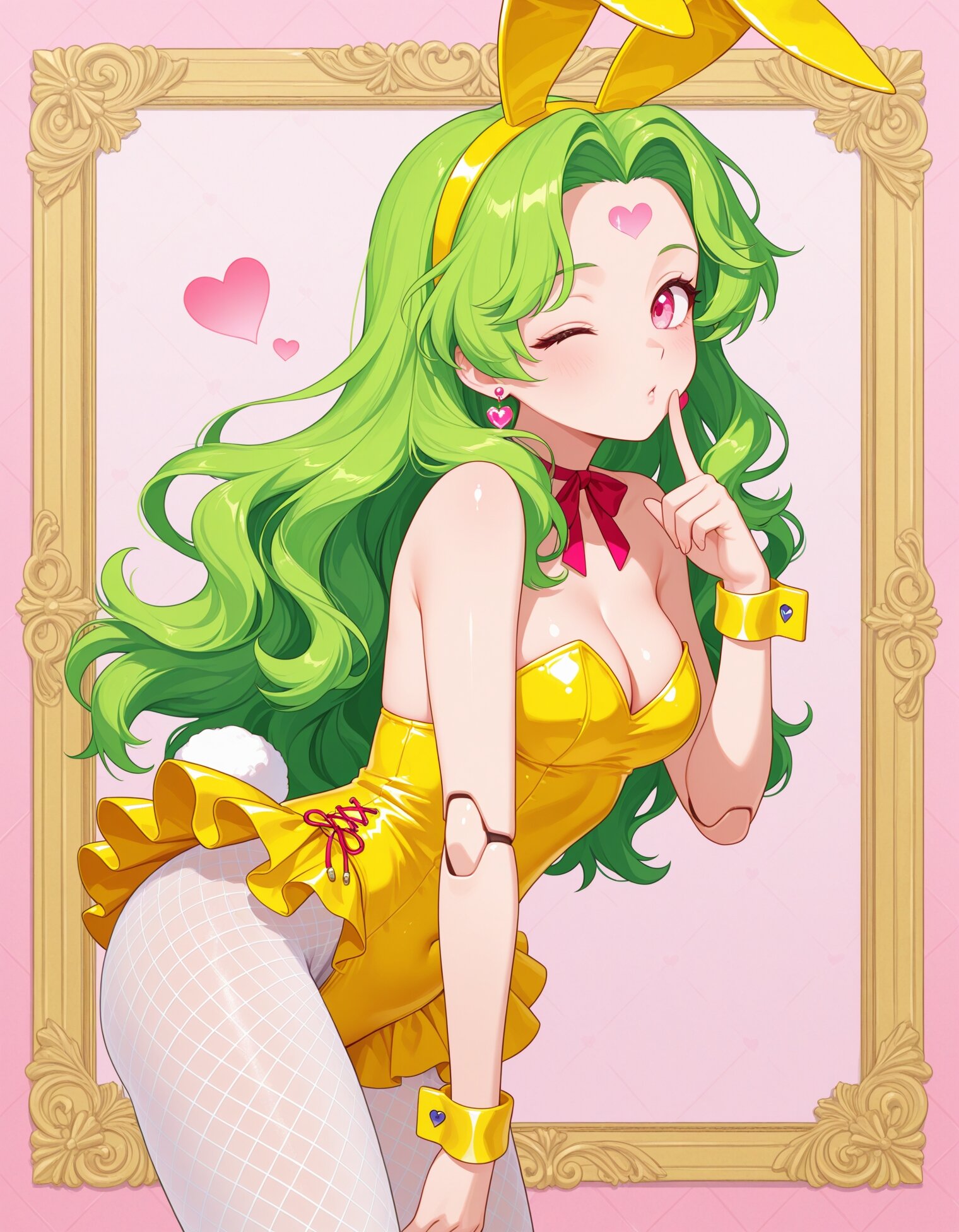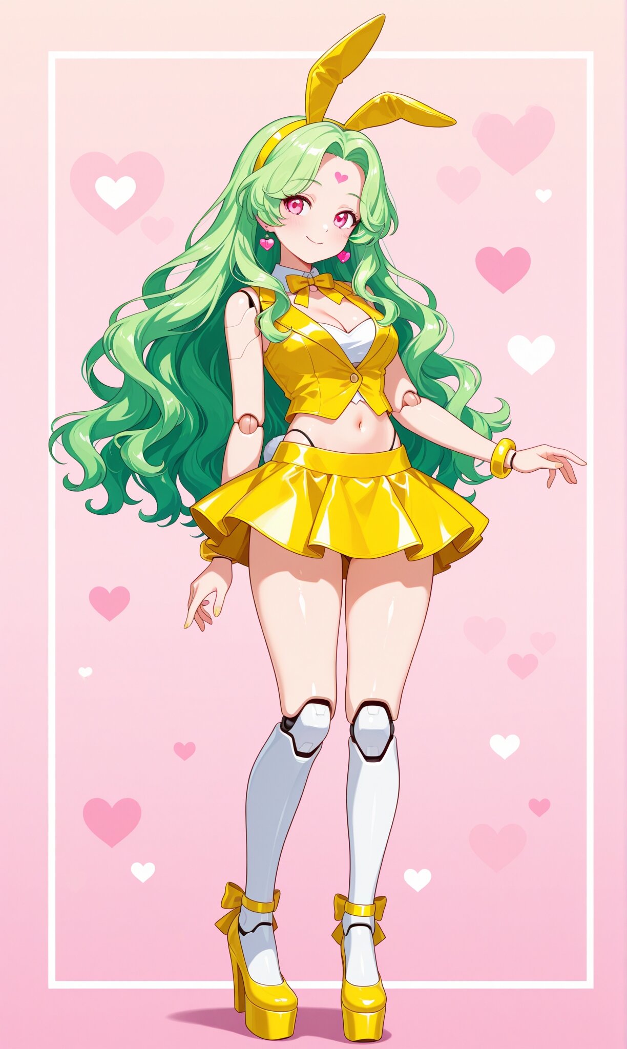 ⑦髪色はエムズ様のカラーであるライトグリーンを使用、額とピアスにハートでロゴのイメージを追加、目を引くように黄色いコスチュームを採用。腰のフリルで可愛さを追加。センターパートでお姉さん間も出してみました!