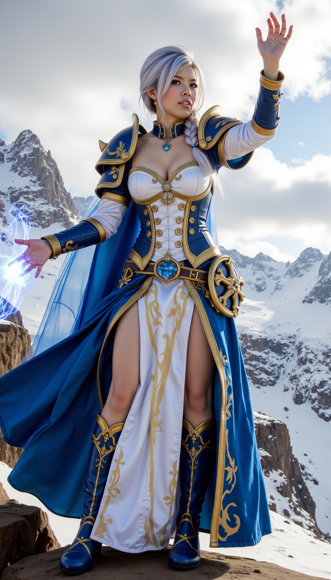 a stunning female sorceress,Jaina Proudmoore,large breasts,white hair with (((gold streaks))),single long braid,wearing an elaborate white corseted blouse with cleavage,blue and gold fantasy-style dress,blue pauldrons and cape,blue boots,necklace with an anchor pendant,She raised her arms and cast a frost magic towards the sky,Standing on a cliff in the Alps,the wind tugging at her cloak. The sky is heavy with clouds,Serious and angry expression,thigh, <lora:nana680228:1>,<lora:midjourney_whisper_innocent_eyes_v01:0.5>,midjourney_whisper_innocent_eyes,<lora:Jaina_rank4_bf16:1>,