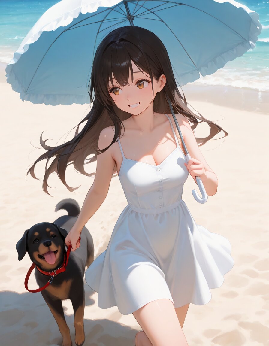 1girl,smile,long hair,gentle smile,looking away,white one-piece dress, running,beach,holding parasol,holding leash,dog,summer, facing viewer,(from side:0.6),from above,very awa,, appropriate posture,appropriate configuration,ideal ratio body proportions,perfect anatomy, <lora:Fixhands_anime_bdsqlsz_V1:1>, masterpiece,best quality,newest,absurdres,highres,ultra high res,8K UHD,hyper-detailed,