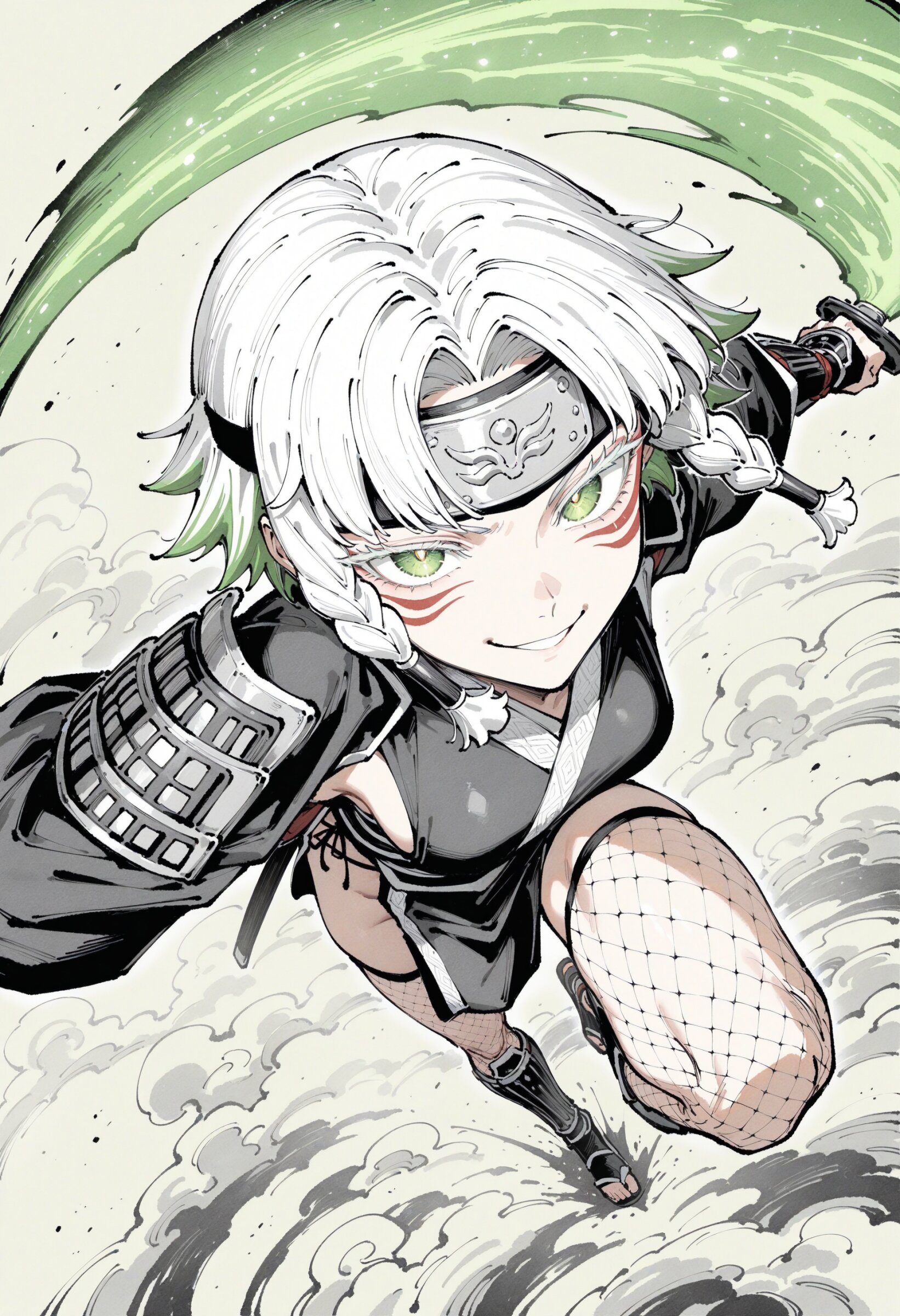 (close up:1.3), knees out of frame (from above,looking up:1.0) looking at viewer, (dutch angle:1.2), paper background, sumi-e, faux traditional media, color ink \(medium\), painting \(medium\), calligraphy brush (medium), , spot color, 1girl, samurai, (muscular female:0.65), ivory hair, beige colored tips, short hair, side braids,curtained hair , hair tubes, colored eyelashes, beautiful lime green eyes medium breasts, ,, ninja cloth, short kimono, obijime, fishnet inner, fishnets, fishnet thighhighs, pelvic curtain, panty straps, kote, (ninjutsu:1.1), (holding ninja sword:1.1) fox maskon head, unworn mask, forehead protector, sideboob, zouri, facial mark, japanese winter clothes, seductive smile, dynamic pose, kung fu attack, kung fu action, kuji-in, ninjutsu, henshin, transformation, smoke, ink wash painting, , ice magic, teach the ways of magic, teacher, super fine concept art, hard surface, 8K, unreal engine, masterpiece, best quality, amazing quality, very aesthetic, absurdres, you can add scenery, (volumetric lighting), To make the background more distinctive. 4ur4_illu,shiny, glowing, glowing particles, glowing light particles, light particles, flame green, professional art lots of details, , overexposure, sumie effect style, <lora:noline (1):-0.5> <lora:sdxl2-flat2-512b:0.0> <lora:facelightup_xl_v10:0.5> <lora:Aura_illu:0.1> <lora:V2_yakumo_alchemy:0.5>