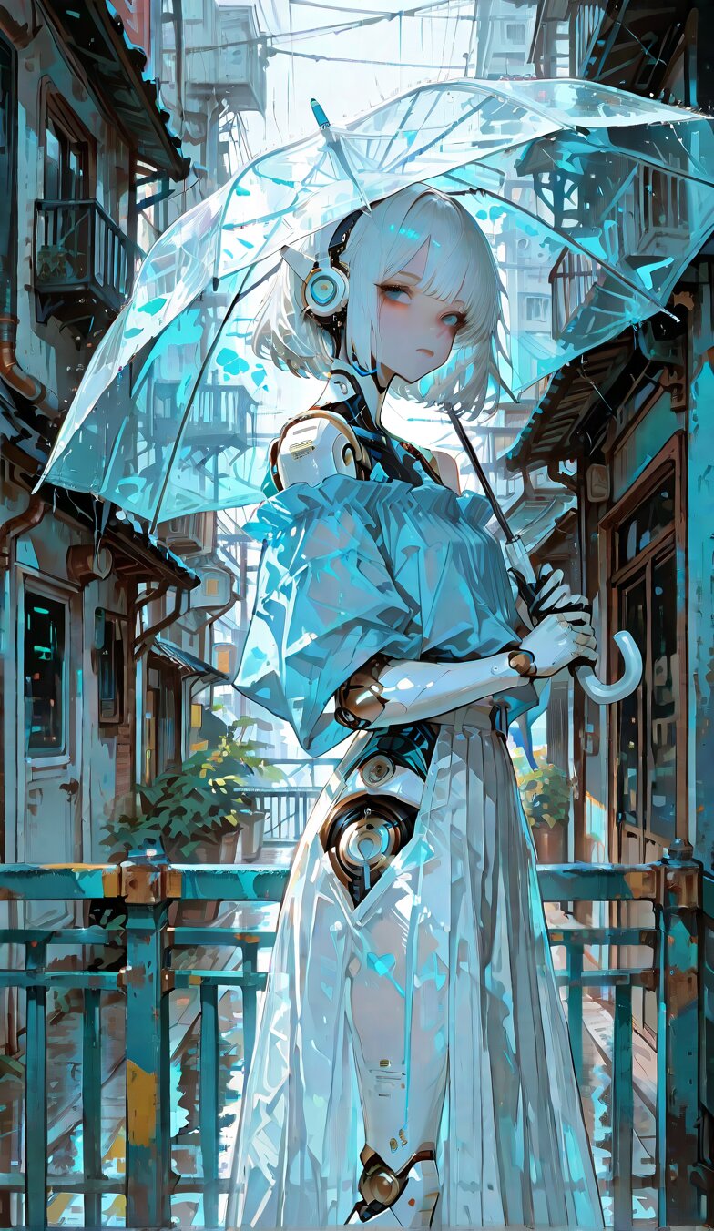 (masterpiece, best quality), amazing quality, very aesthetic, absurdres, highres, newest ,looking at viewer, 1girl, solo, short hair, bangs, blue eyes, skirt, shirt, holding, closed mouth, standing, white hair, off shoulders , outdoors, feet out of frame, umbrella, expressionless, pleated skirt, blue shirt, building, rain, long skirt, holding umbrella, railing, android, joints, transparent, robot joints,mechanical arms, [realistic:45], score_9,score_8_up,score_7_up,source_anime,Unl1c2Fr, Unl1, c2Fr, science fiction,s1_dram,