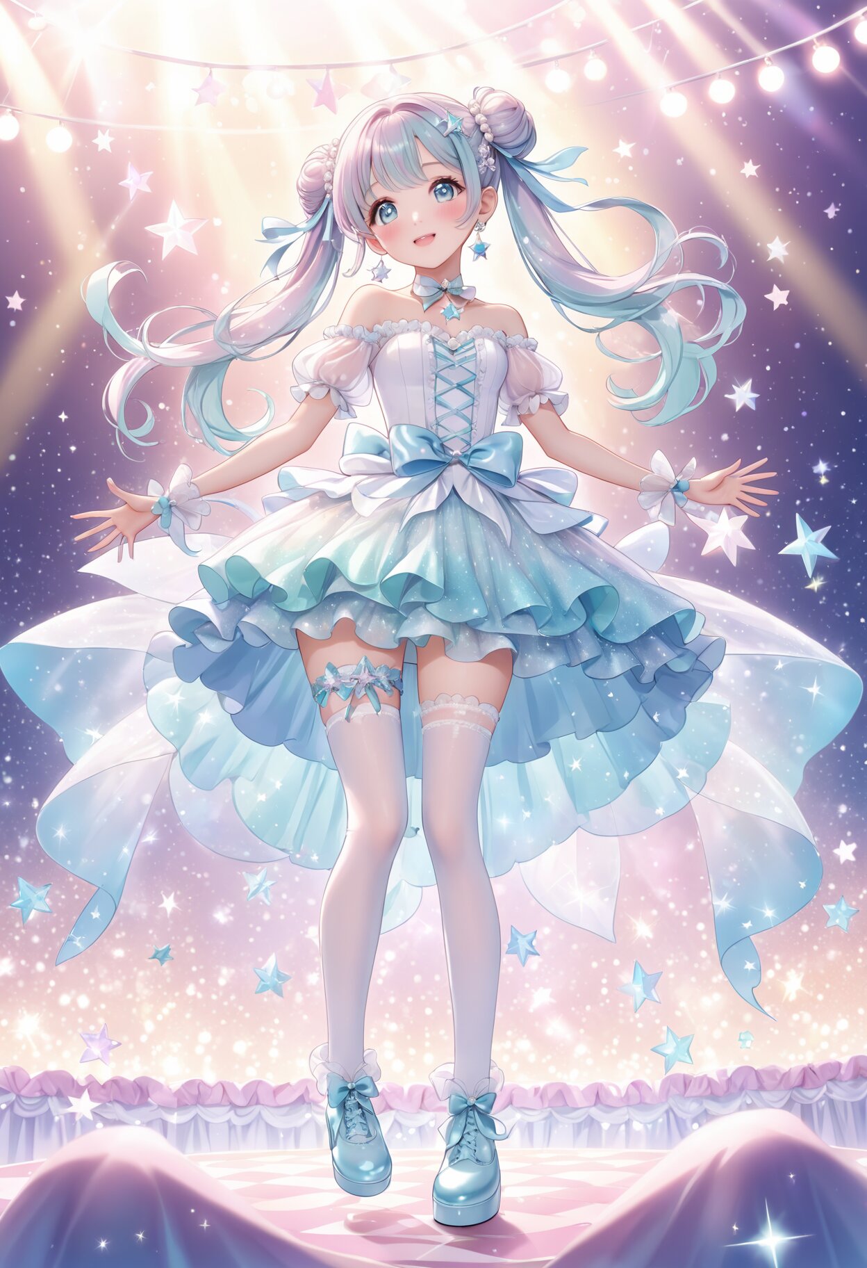 futuristic idol outfit, pastel color palette, pearl white and aqua blue, off-shoulder frilled mini dress, glowing heart-shaped chest jewel, star motifs on dress, sheer puff sleeves, iridescent fabric, thigh-high white stockings with blue garter ribbons, aqua lace-up ankle boots, twintails with bun hairstyle, star-shaped hair accessories, dreamy magical girl aesthetic, soft lighting, pastel sky background, fantasy concert stage, shimmering sparkles