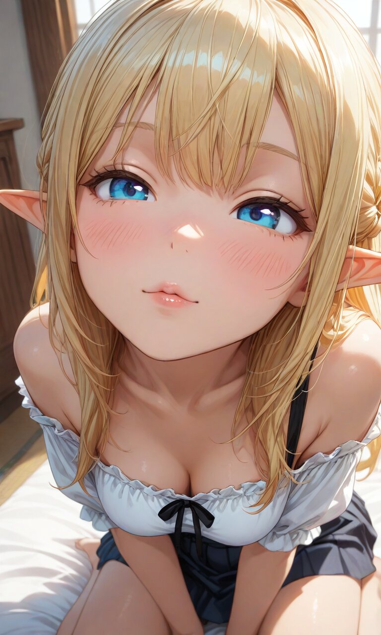 score_9, score_8_up, score_7_up, source_realistic, masterpiece, amazing quality, very aesthetic, high resolution, ultra-detailed, absurdres, newest, scenery, Semi-realistic, realistic, photorealistic, 3d Render, sharp focus, nice hands, perfect hands, perfect anatomy, perfect structure, (theme is Passionate kissing scene), (On a Morning, the girl is sitting ion the rug n living, gaze at me with an kissing face), wariza, indoors, 1girl, solo, bust shot, from the front, high angle, ((((close-up eyes:1.2, face focus)))), POV, (She is wearing an off-the-shoulder blouse, pleats skirt). bare one shoulder. ultra detailed lips, ultra detailed face and hair, kawaii, adorable, cute, elf girl, (apatite eyes with CGI Effect, close eyes, Moist eyes), (deep blonde hair:1.2), medium breasts, wide hip, BREAK, masterpiece, best quality, amazing quality, very aesthetic, high resolution, ultra-detailed, absurdres, newest, scenery,