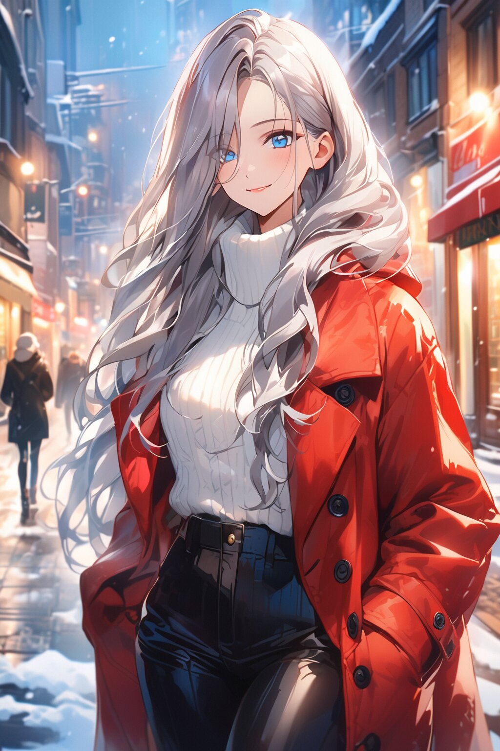 lady, silver hair, long hair, blue eyes, seductive smile,coat, white blouse, (black pants), cowboy shot, street, winter,