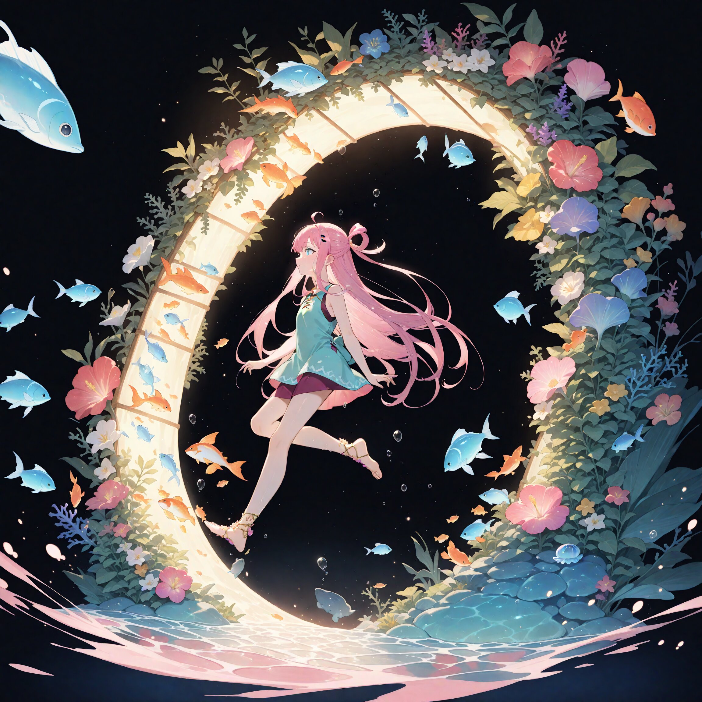 anime, (black background:1.2), (double exposure magenta silhouette:1.2) long hair, half updo hairline ahoge hair rings girl and (((zero gravity,weightlessness,flying,floating in the air)),((arbor)) ,wonderland,((tropical fish, flock of tropical fish, colorful tropical fish, underwater, in the sea,school of fish, seaweed,jellyfish,pillar of light)), ((large shellfish,coral reef,airbladder:1.3 )), (((larg anchor,Deep sea background ))),goddess,((((large amount of fish)))),((garden)),Visual impact, wet shiny skin,:0.5) photo scenery, wearing (woodland nymph tunic:1.2), floral wreath, barefoot sandals, 4ur4_illu,shiny, glowing, glowing particles, glowing light particles, light particles, flame magenta, <lora:noline (1):-0.5> <lora:sdxl2-flat2-512b:0.2> <lora:facelightup_xl_v10:0.5>