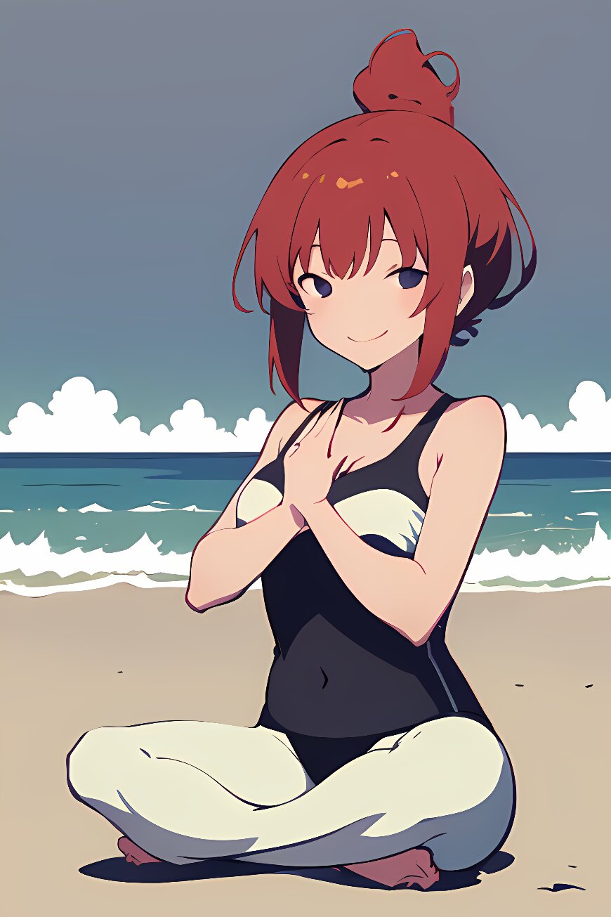 1 lady, (morning, smile, beach), ((yoga)),Art Style 2.0,anime minimalist