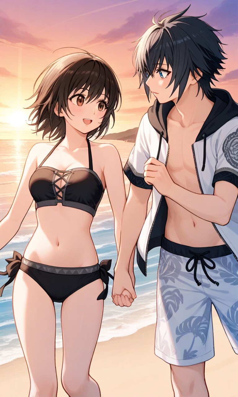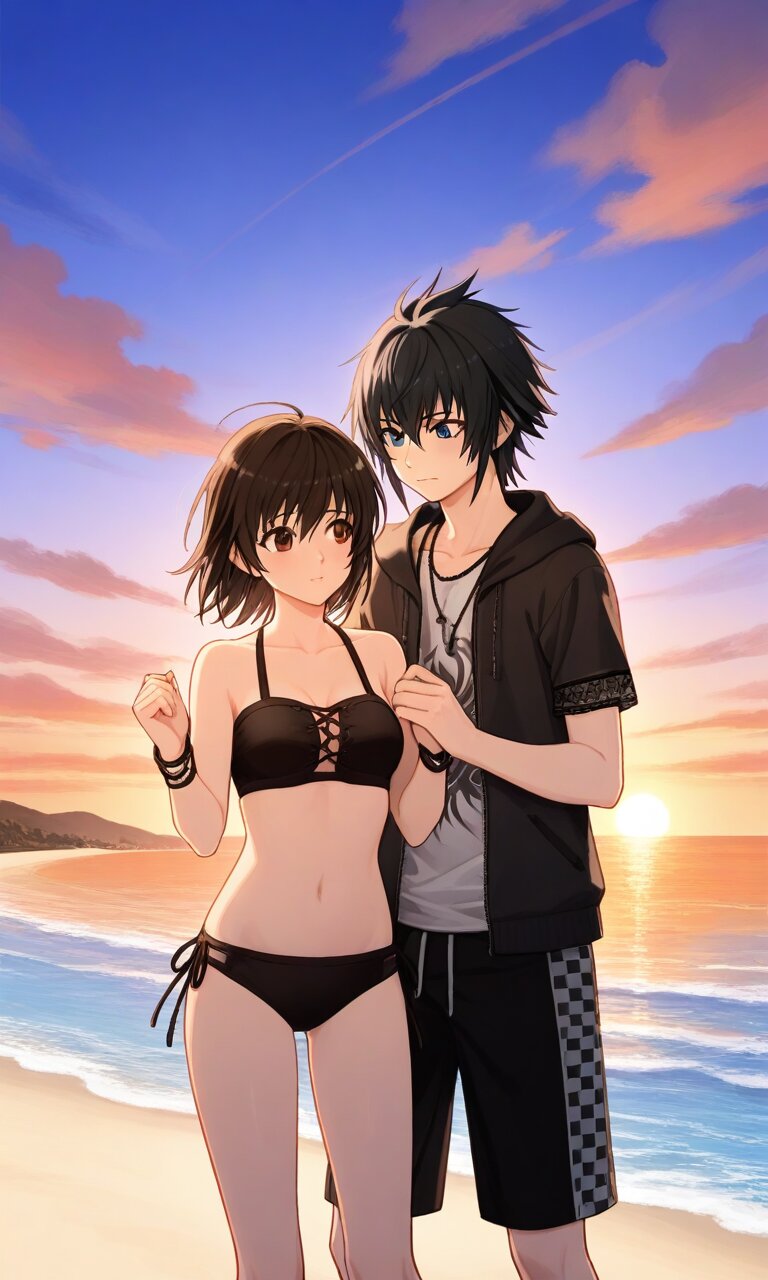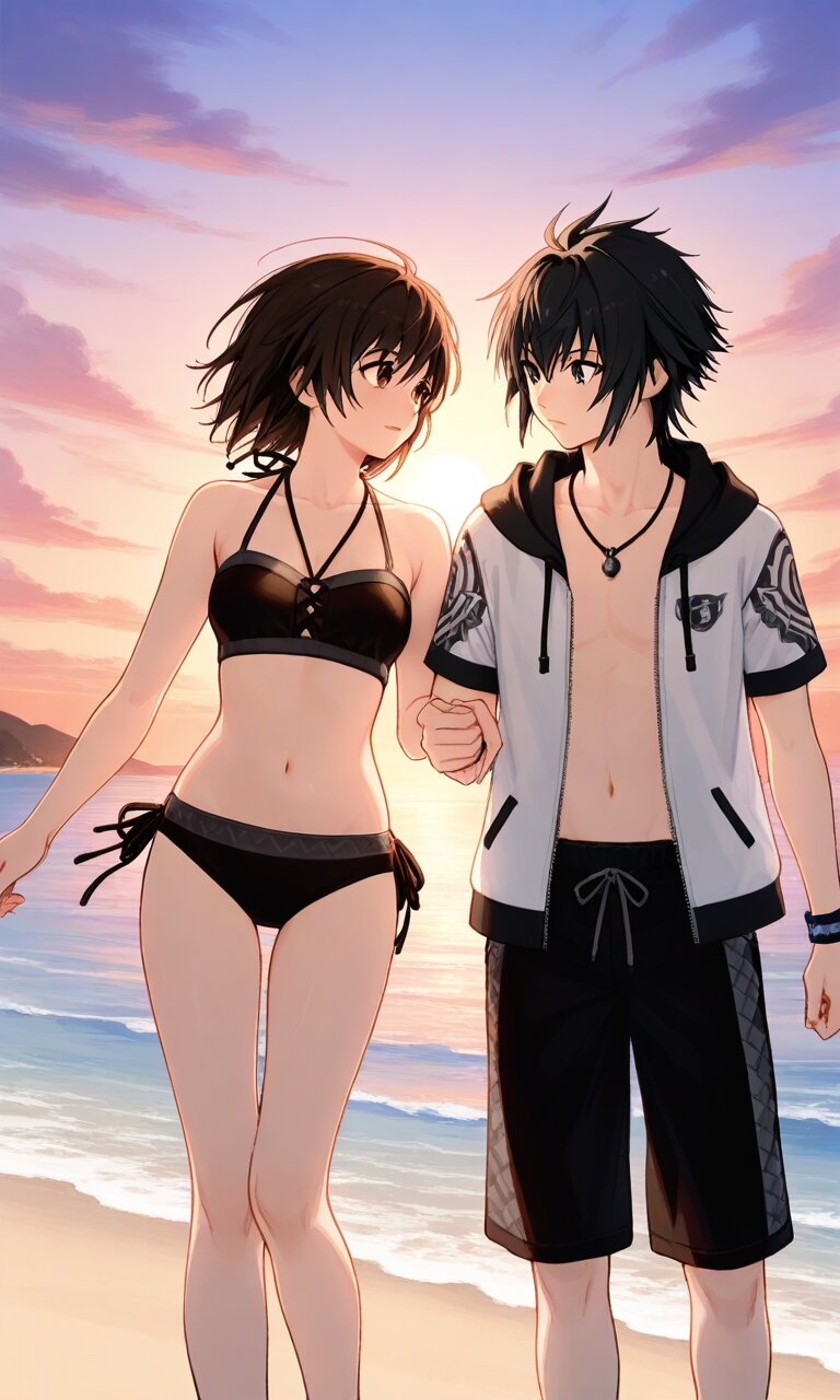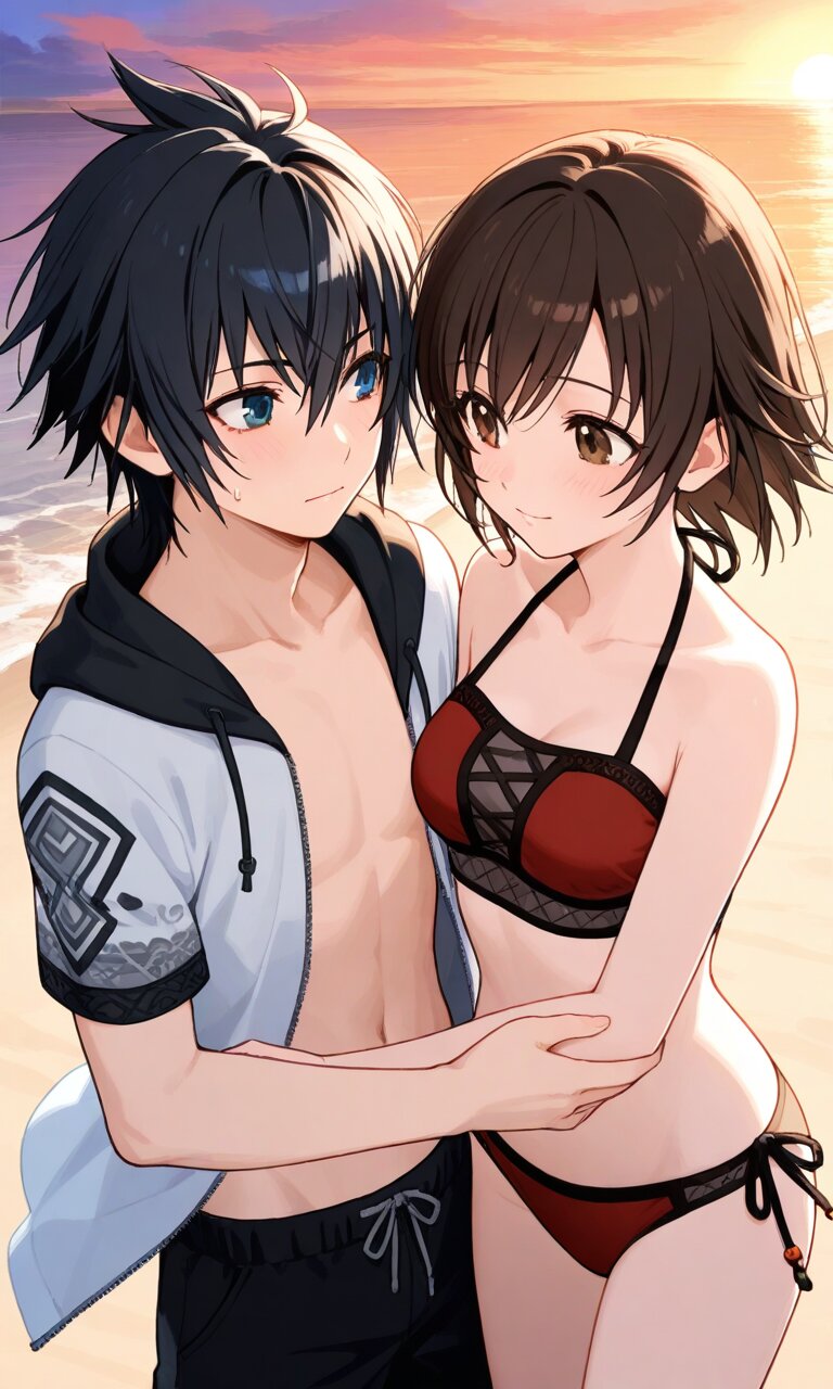 Couple, boy and girl, two people only,absurdres, ultra-detailed, master piece, high resolution, 8k, Boy, girl, couple,beach, walk, evening, sunset, splash, summer, light clothing, BREAK girl, bikini, tube top bikini bra, open hoodie, bikini pants BREAK the boy(FFNoctis, 1boy, black hair, blue eyes ) BREAK the girl(Iris Amicitia, female,brown eyes, ),