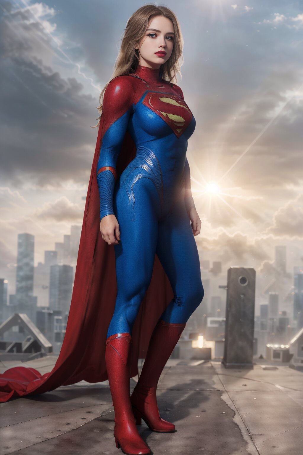 masterpiece,(ultra realistic),32k,extremely detailed CG unity 8k wallpaper, best quality,realistic photo, fantastic light, American girl, ((Supergirl)), (small head), serious expression, red cloak, red boots, perfect body, pants, red lips, (bright blue eyes), eyes detail, skin detail, slender figure, small waist, long legs, small thighs, (long blonde hair:1.2), medium breasts, (flying lean forward in the sky:1.4), (simple background:1.4),(dynamic pose),dynamic angle, sunlight, light on face,naturepron,upper body, <lora:sashaCalleLora_v10:0.7> <lora:russianDollLikeness_v3:0.5:1,0,0,0,1,1,0,1,1,1,0,1,1,1,1,1,1> <lora:naturepron_nolabels:1> <lora:add_detail:-1>