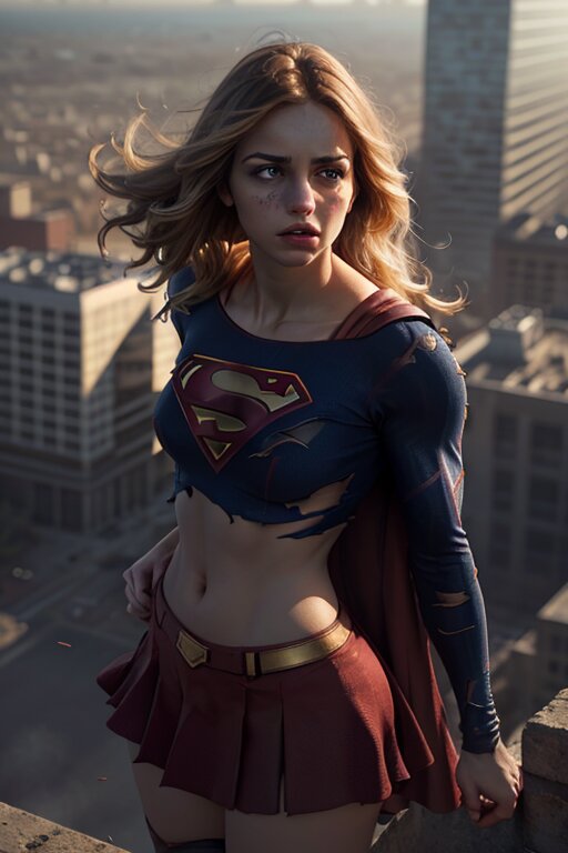 8k, best quality, real picture, intricate details, ultra-detailed, ultra highres, depth field,(photorealistic,realistic:1.2),masterpiece,photo of european girl, supergirl, (bruise, dirty, torn clothes, revealing clothes), blue eyes, blonde hair, long hair, ripped cape, ripped pantyhose, superhero, solo, sun, blue sky,top of skyscraper, from_above, best quality, realistic, photorealistic, (intricate details:1.2), (delicate detailed), (cinematic light), clear line, sharp focus, realistic face, detailed face, unity 8k wallpaper, ultra high res, (photorealistic:1.4), looking at viewer <lora:Supergirl:1>