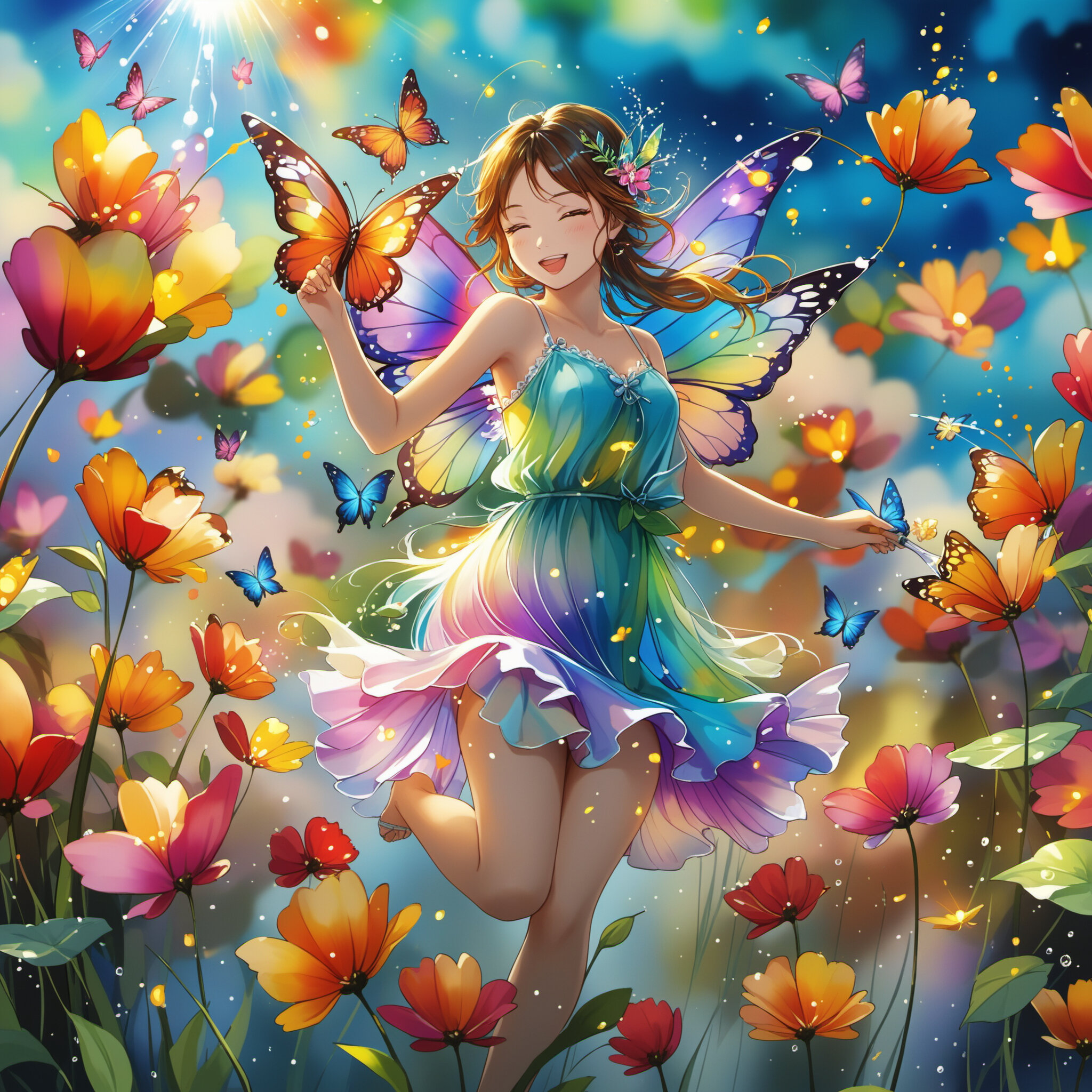 masterpiece, best quality, (Photorealistic:0.5),animation style, anime colored, illustration, Fairies are flying happily in the sky. 2 Colorful butterflies are flying happily around them, shining with light. the fairy is using a dropper to drop the ink into the pond. After it touches the water surface, the ink spreads out, revealing colorful colors. surrounded by a swirling aura of prismatic light, Two angel children are doodling on the surface of the water. Break The colorful inks on the surface of the water create a beautiful color. Colorful birds and peacocks are flying gracefully on the surface of the water.Spring scenery, look at viewer, BREAK Lapis lazuli, rainbow,Dripping Paint Splatter Art, dramatic, paint drips, splatters, dripping paint