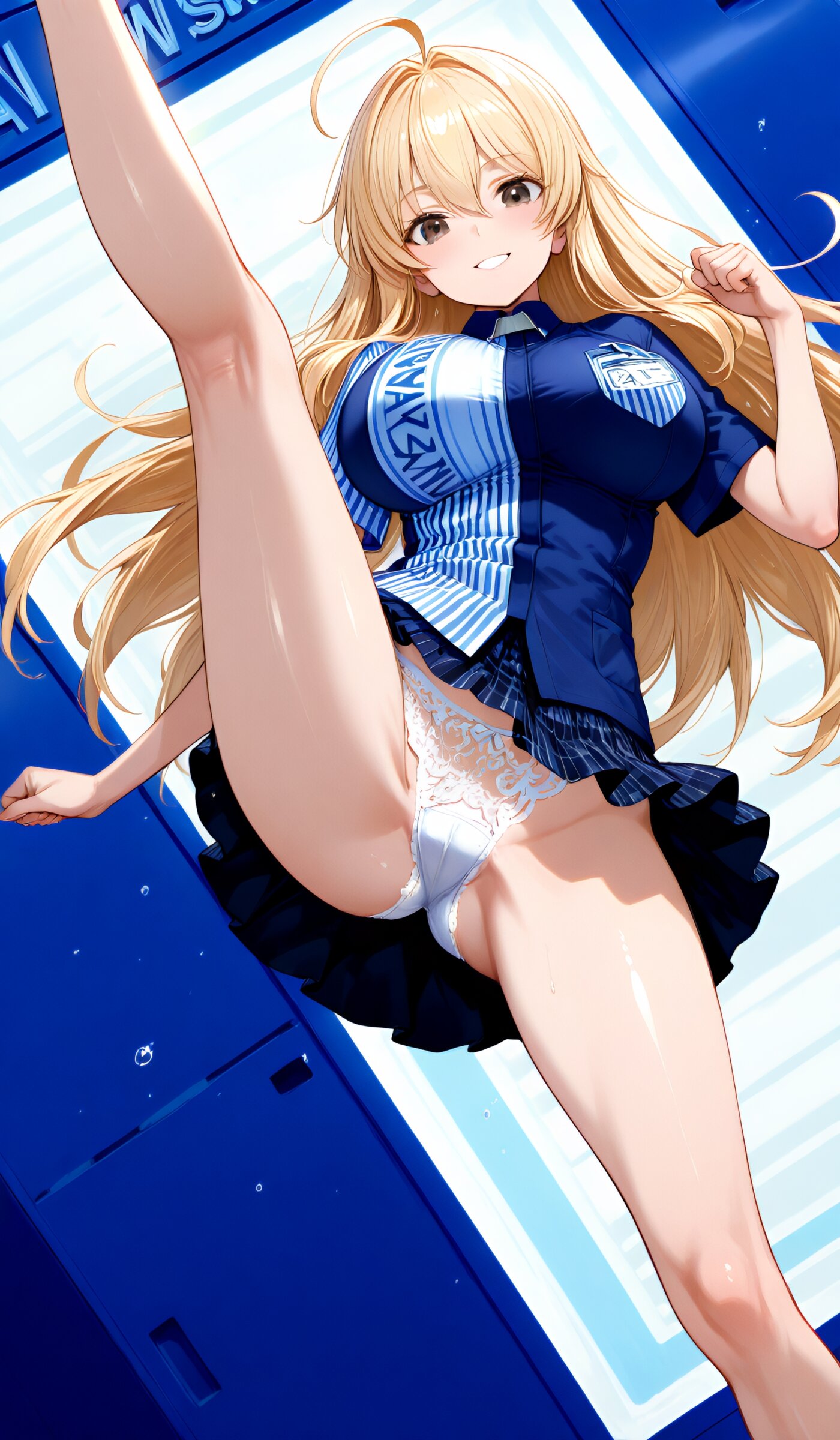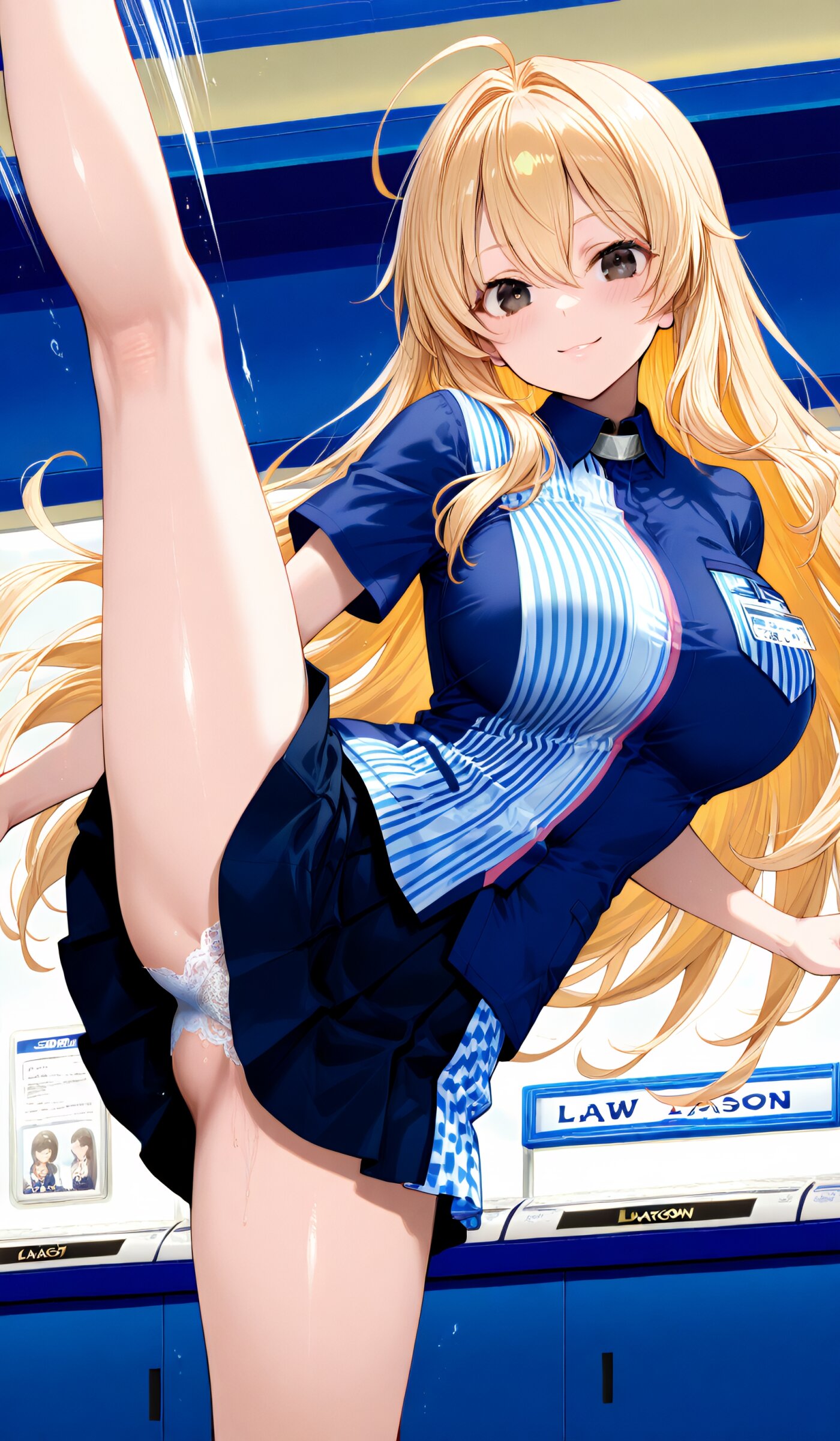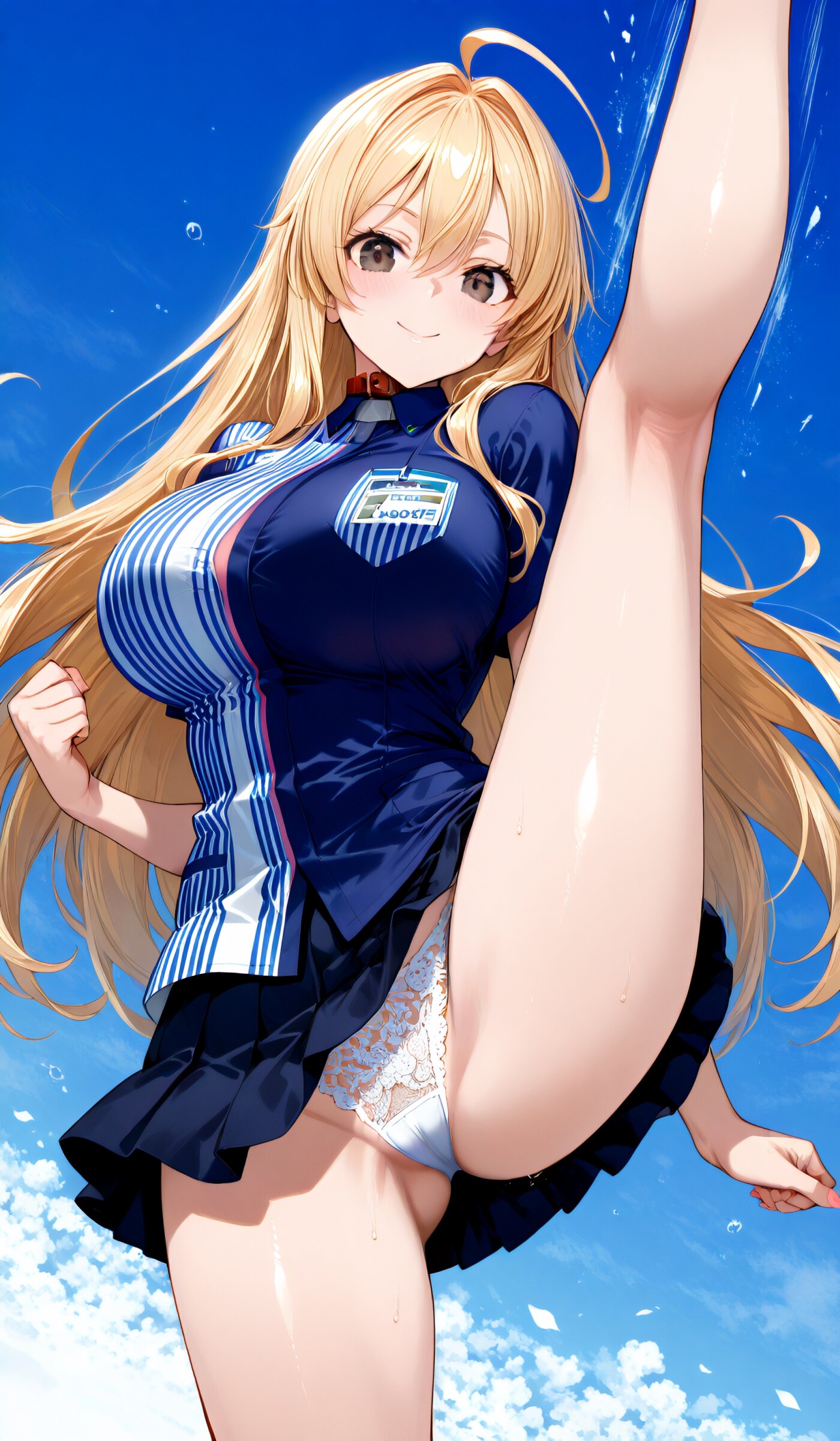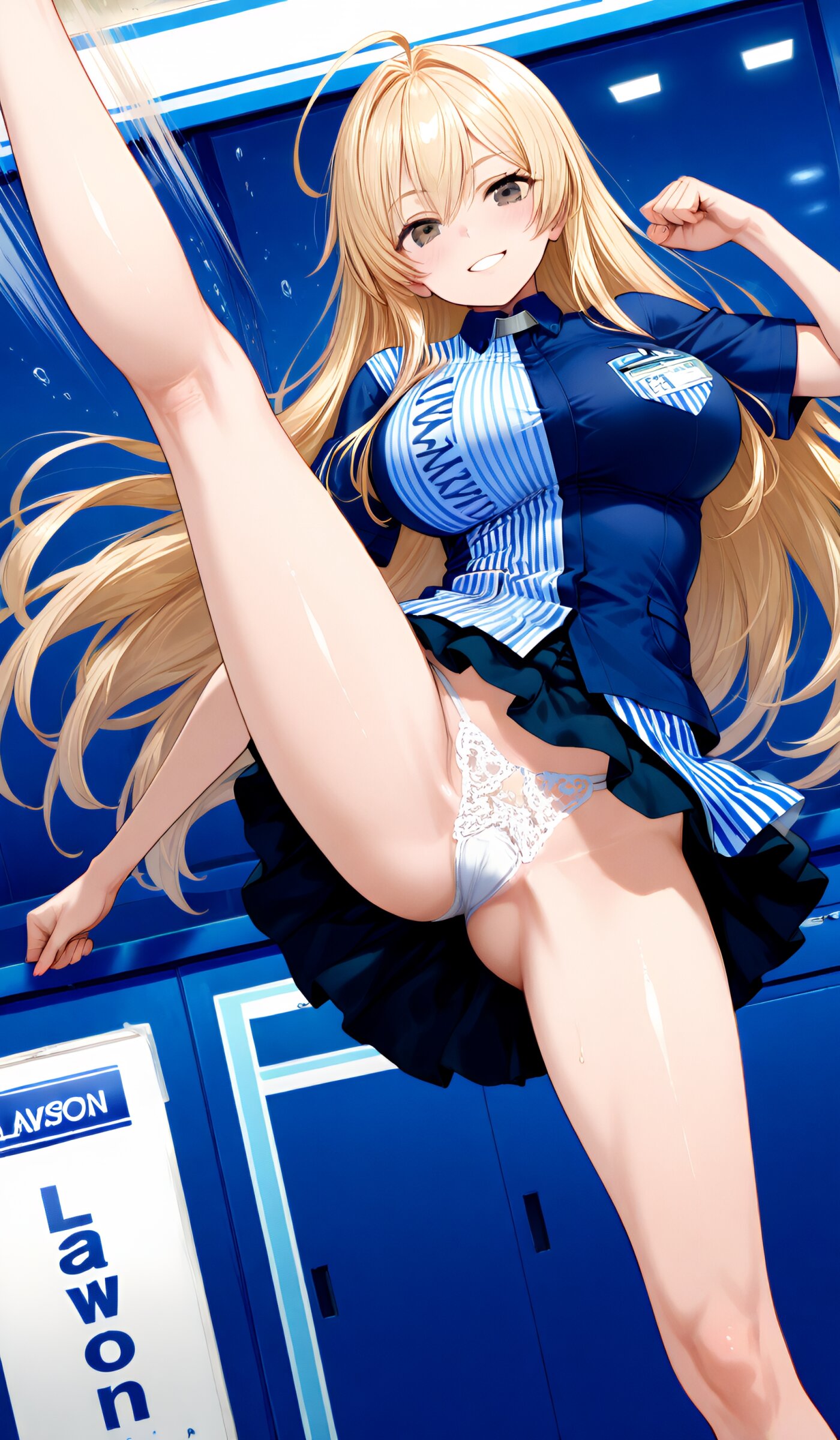 1 cute girl,(long blond hair), (dark copper eyes), ahoge:1.3,(collar:1.2),(shiny eyes:1.2), (eyes highlight:1.2),(large breast and hips), (Lawson uniform:1.4),(name plate:1.5),(upper body:1.8),(hi kick:1.4),(looking at viewer),(long legs:1.8),(smile:1.3),(pale lace panty:1.5), (dynamic angle),(dynamic pose), (Lawson skirt), masterpiece, best quality, ultra-detailed, 8k resolution, very aesthetic, amazing quality, <lora:noobai_ep11_stabilizer_v0.11_fp16:0.7> <lora:StS-Illustrious-Detail-Slider-v1.0:2.> <lora:sdxl-hairdetailer_02:2> <lora:xl_more_art-full_v1:1.4> <lora:spo_sdxl_10ep_4k-data_lora_webui:0.7>