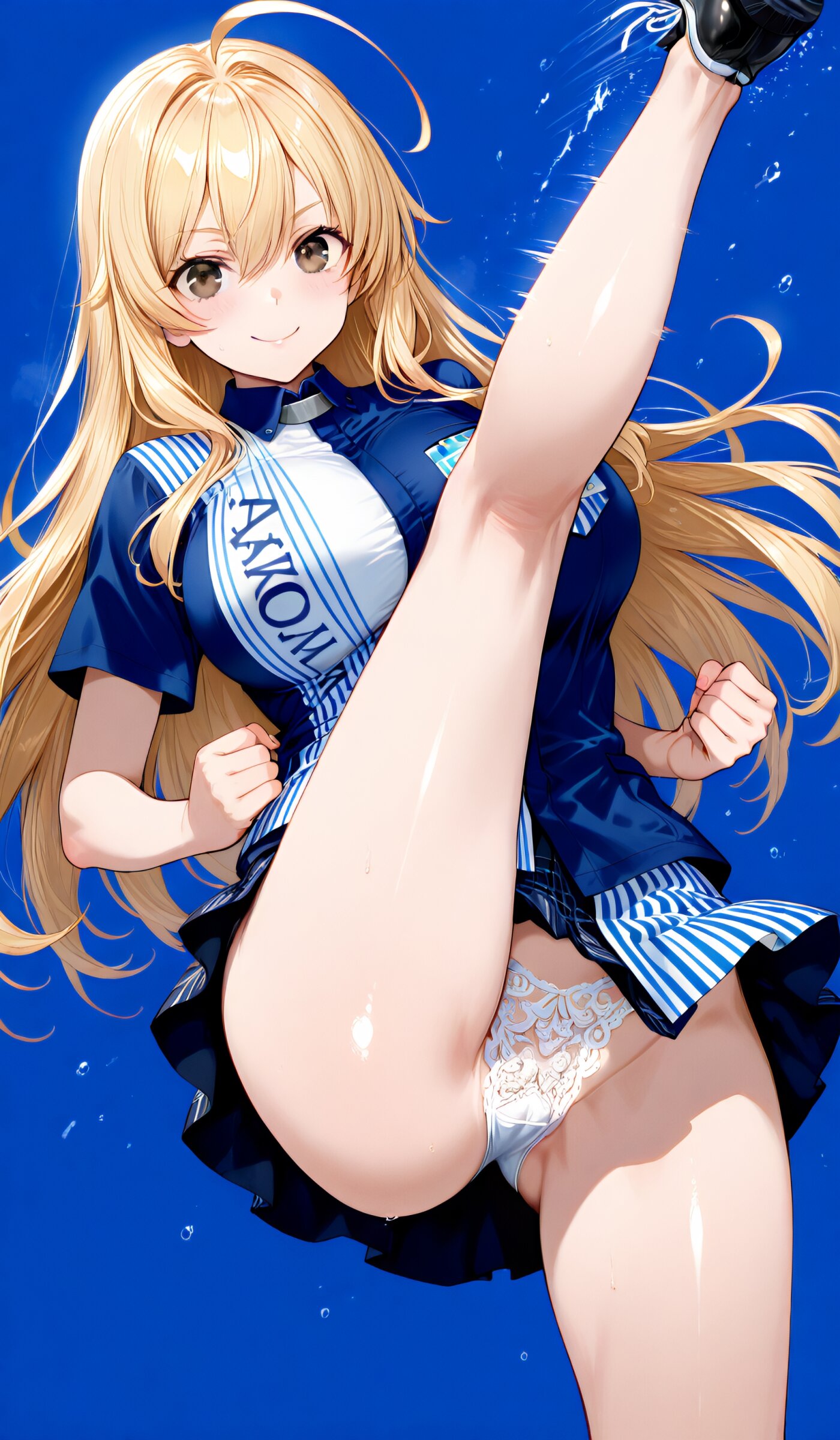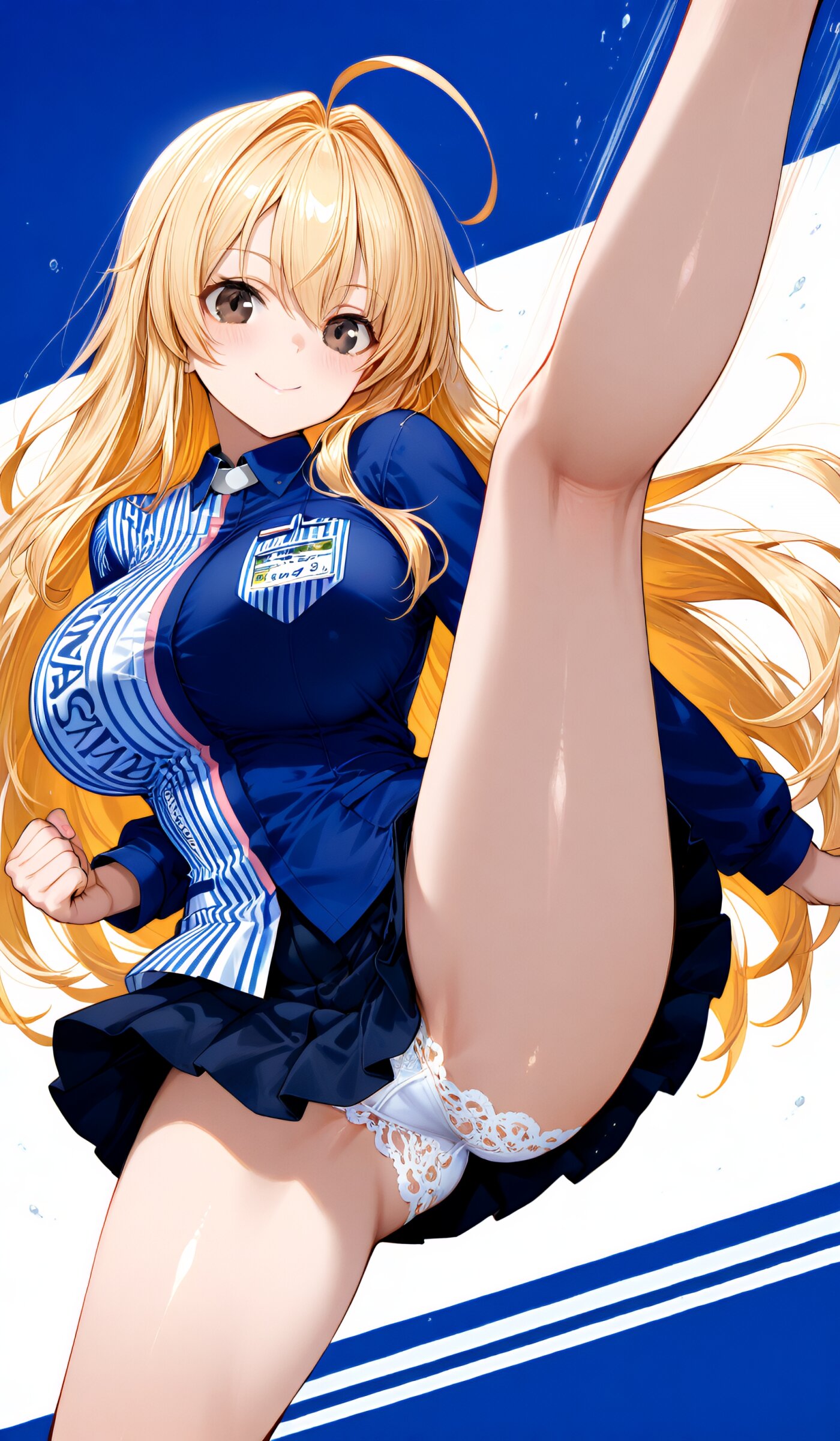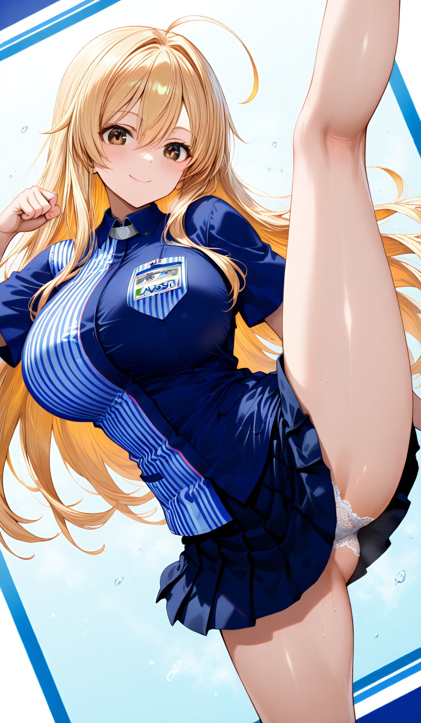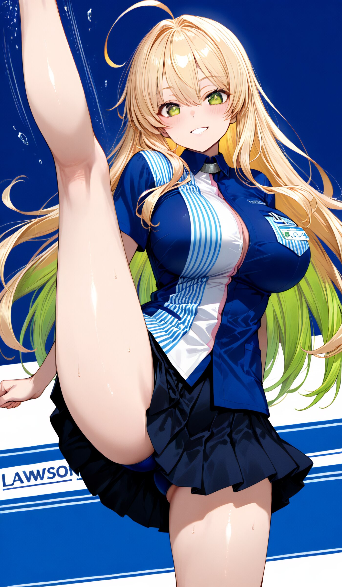 1 cute girl,(long blond hair), (dark copper eyes), ahoge:1.3,(collar:1.2),(shiny eyes:1.2), (eyes highlight:1.2),(large breast and hips), (Lawson uniform:1.4),(name plate:1.5),(upper body:1.8),(hi kick:1.4),(looking at viewer),(long legs:1.8),(smile:1.3),(pale lace panty:1.5), (dynamic angle),(dynamic pose), (Lawson skirt), masterpiece, best quality, ultra-detailed, 8k resolution, very aesthetic, amazing quality, <lora:noobai_ep11_stabilizer_v0.11_fp16:0.7> <lora:StS-Illustrious-Detail-Slider-v1.0:2.> <lora:sdxl-hairdetailer_02:2> <lora:xl_more_art-full_v1:1.4> <lora:spo_sdxl_10ep_4k-data_lora_webui:0.7>