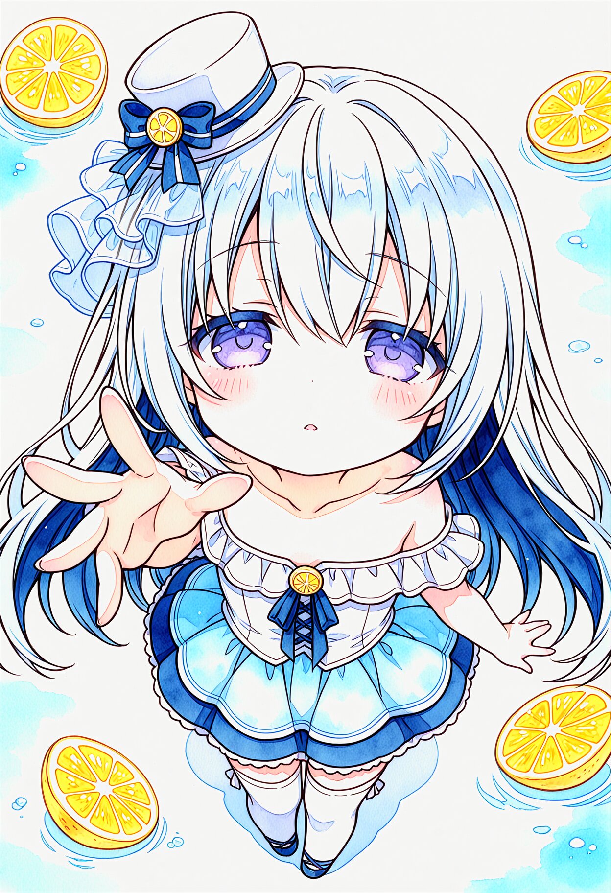 best quality, pale color, pastel colors, (watercolor_\(medium\):1.4), full body, portrait, solo, (chibi:1.2), (chibi girl:1.3), collarbone, parted lips,(Expressionless:0.8), (half-closed eyes:0.8), pale purple eyes, tareme, (silver hair:1.1), (dark blue hair colored inner hair:0.8), long hair,very long hair,, eyebrows visible through hair, white off-shoulder and dark blue skirt, mini hat,strapping ribbon, see-through veil, thighhighs, looking after, lemon, (from above,:1.2) (feminine pose:1.2), reaching towards viewer, <lora:noline-16oa:-1.2> <lora:chibi_paru:-1.3> <lora:sdxl2-flat2-512b:-1.1> <lora:LECO_Solo:-1.8>