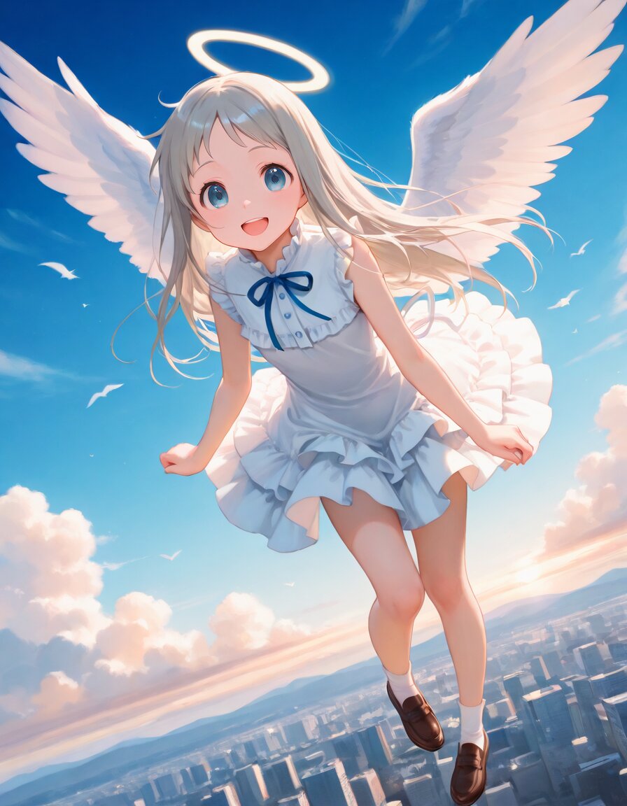 1girl,solo,angel,angel wings,small breasts,(honma meiko),short pixie cut,anime girl,white one-piece dress,white socks,brown loafers,flying,mid-air pose,smiling,windy hair,outdoors,blue sky,clouds,sunny,dynamic angle,low angle,full body,cheerful,energetic,motion blur,Over the city,<CCpkmnStyleMix>,watercolor texture,gradient colors,gradient watercolor,traditional media,watercolor (medium),(watercolor),painting (medium),, appropriate posture,appropriate configuration,ideal ratio body proportions,perfect anatomy, <lora:Fixhands_anime_bdsqlsz_V1:1>, masterpiece,best quality,newest,absurdres,highres,ultra high res,8K UHD,hyper-detailed,