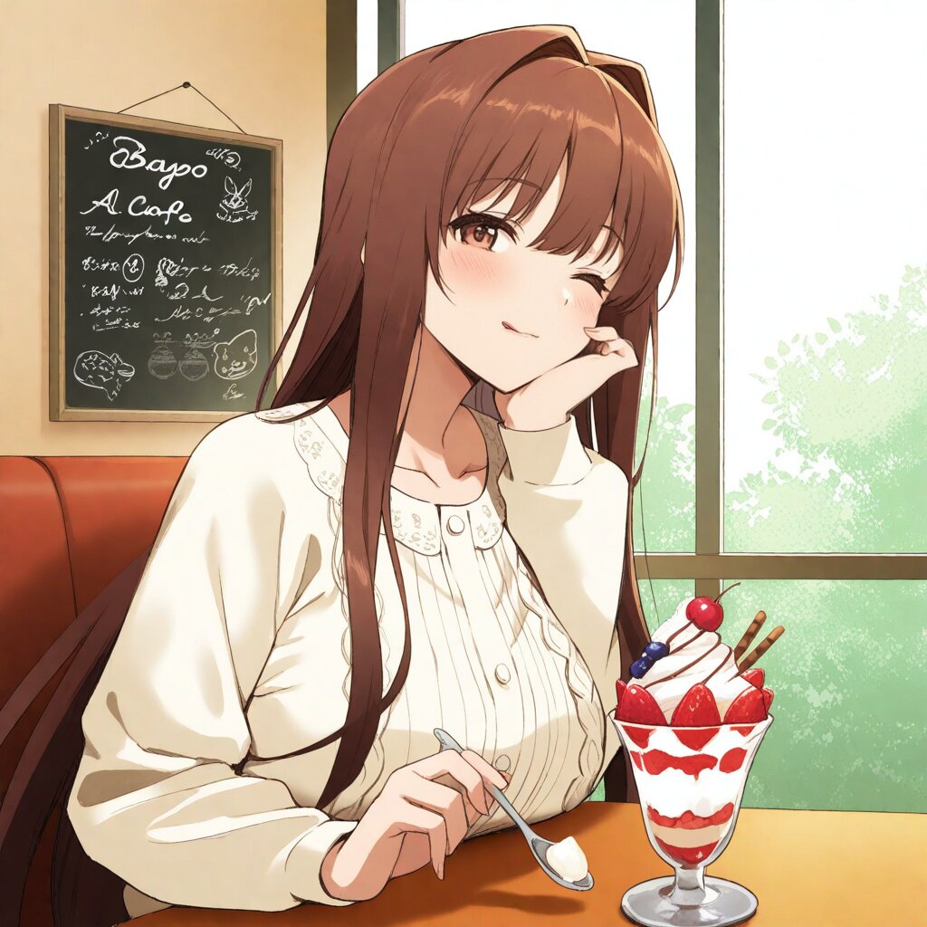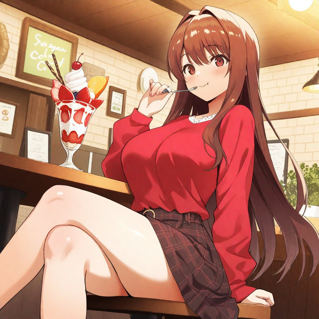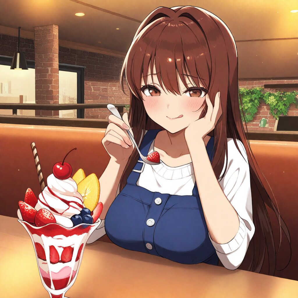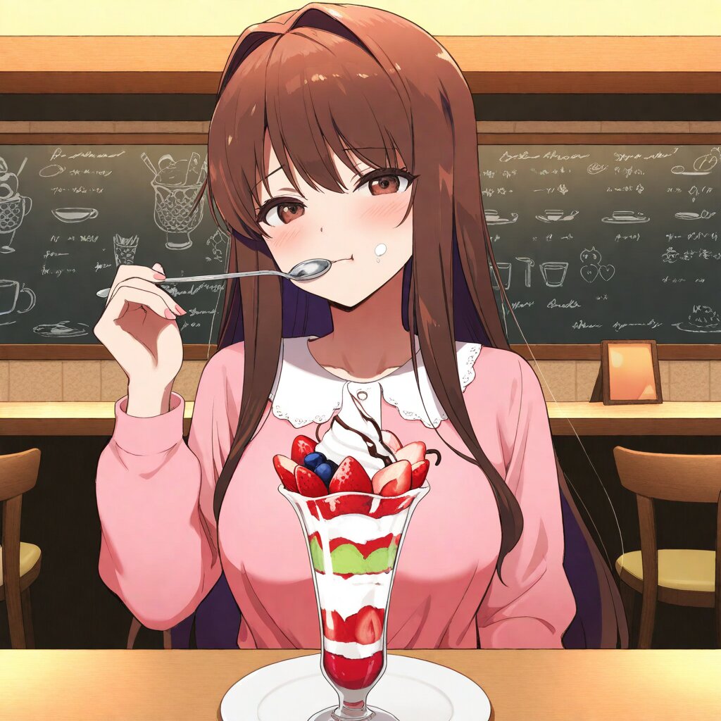 masterpiece,best quality,amazing quality,very aesthetic,absurdres,newest,highres,okashirastyle,8k,extremely detailed CG unity 8k wallpaper,(perfect face:1.2),1lady, 27yo, long_hair, brown_hair, red_eyes, hair_between_eyes, very_long_hair, brown_eyes, red_hair, floating_hair, hair_intakes, straight_hair, shiny_skin, (medium_breasts:1.2), lady is sitting at a cozy caf� table, her cheeks puffed out as she joyfully stuffs her mouth full with a vibrant fruit parfait. Her eyes are closed in sheer delight, and her left hand gently rests on her cheek, emphasizing her enjoyboyst. In her right hand, she holds a spoon, bringing a scoop of the colorful parfait to her mouth. The parfait is a delightful mix of fresh kiwi, strawberries, boygo, and blueberries, topped with whipped cream and a cherry, perfectly balanced to avoid any spills. lady's expression is comically exaggerated, capturing her sheer delight and enthusiasm, while she skillfully boyages to keep her chest free of any cream. The scene is set in a warmly lit caf�, with a playful and lighthearted atmosphere that enhances the joyful moboyst.
