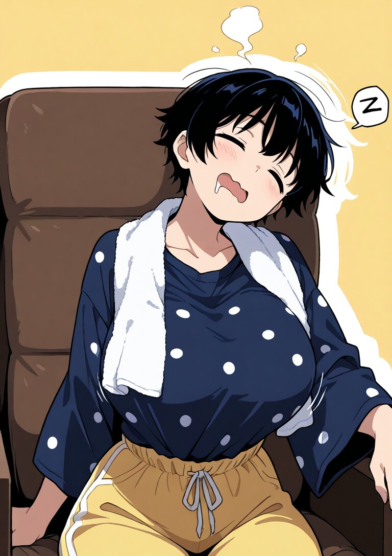 1girl,tomboy,(huge breasts),slim,curvy,(wide hips),thick thighs,black hair,short hair,tareme,closed eyes,black eyebrows,black pajama,polka-dots pajama T-shirt,T-shirt tucked in,long sleeves,wide sleeves,yellow pajama pants,loose pants,wide bottoms,hot body,steaming body,head steam,wavy mouth,drooling,open mouth,shiny skin,body blush,sleepy,towel around neck,leaning side,sitting on easy-chair,armchair,hands rest,head tilt,motion lines,motion blur,motion trails,spoken zzz,white outline,yellow background,hair shade,upper body,sidelighting,three-quarter view,((high contrast:1.2)),(stylized),(kawaii),(anime coloring),(cute),gddw,((correct_anatomy)),flat color