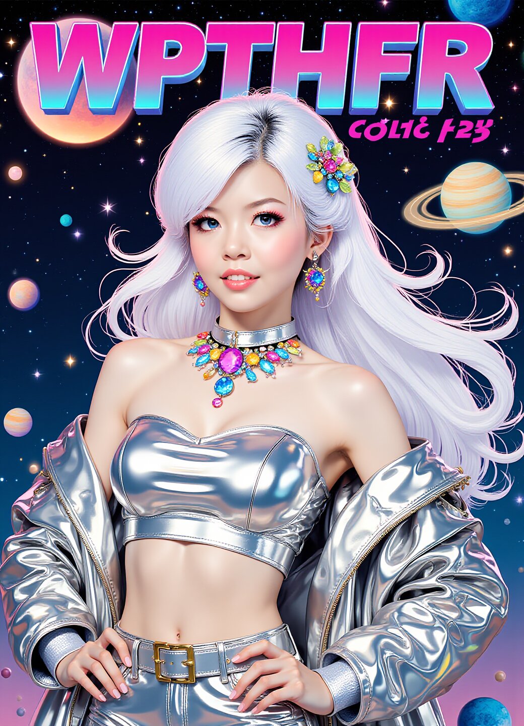 Cassiopeia, This is a vibrant, digital artwork featuring a young woman with long, flowing, platinum blonde hair and striking blue eyes. She has a fair complexion and a slender, athletic build. She is dressed in a futuristic, metallic silver outfit consisting of a crop top that accentuates her medium-sized breasts and high-waisted pants that cinch at the waist with a belt. Over her outfit, she wears a shiny, reflective silver jacket that adds to the sci-fi aesthetic. Her outfit is accessorized with large, colorful earrings and a matching necklace, which adds a touch of glamour.The background is a deep, dark blue, filled with various celestial objects such as stars, moons, and planets, creating a cosmic theme. The word "WPTHFR" is prominently displayed in neon pink and blue letters at the top left, suggesting a possible title or brand name. The overall style of the artwork is highly detailed, with a polished, glossy finish that gives the metallic elements a reflective, almost liquid-**** texture. The composition is dynamic, with the subject's pose suggesting confidence and authority. The artwork combines elements of anime and sci-fi art, creating a striking and visually captivating image.,<lora:nana680228:1>,nana680228,<lora:FLUX|Y2K girl manga style-Cassiopeia_TypeB V1.2.0:1>,