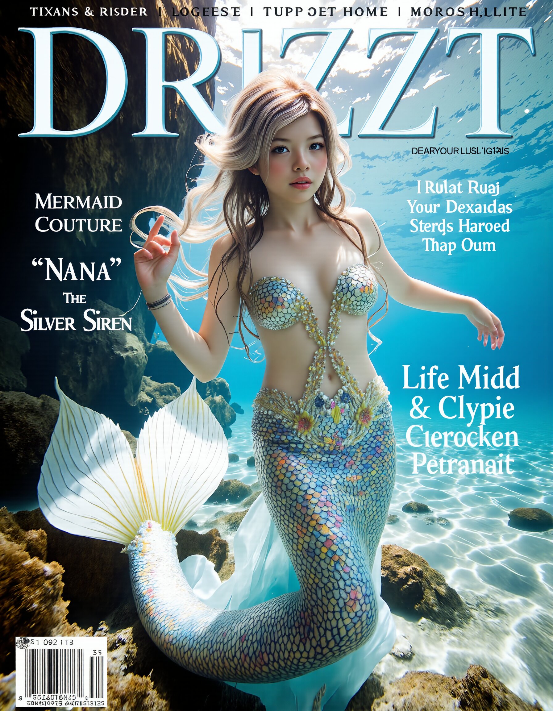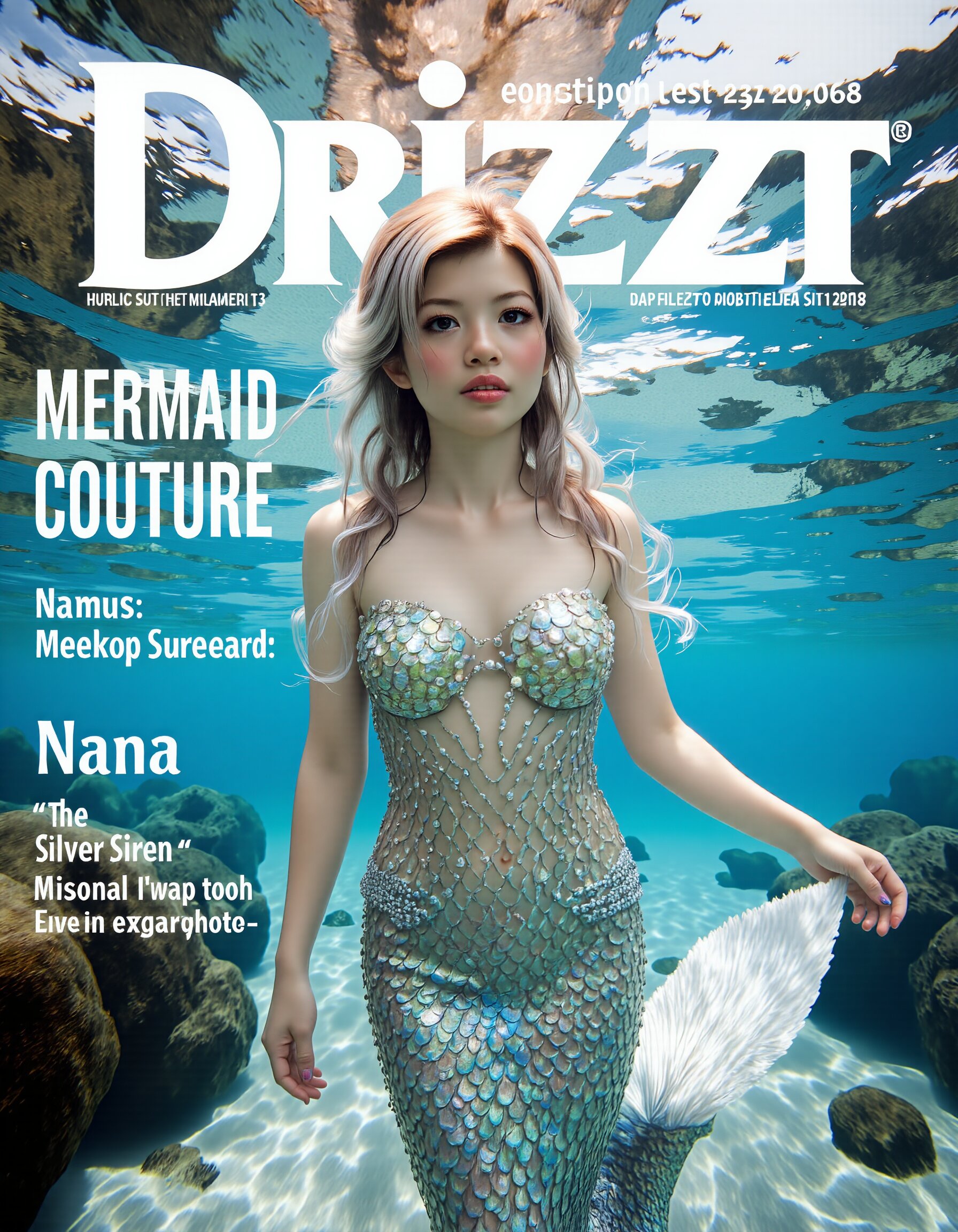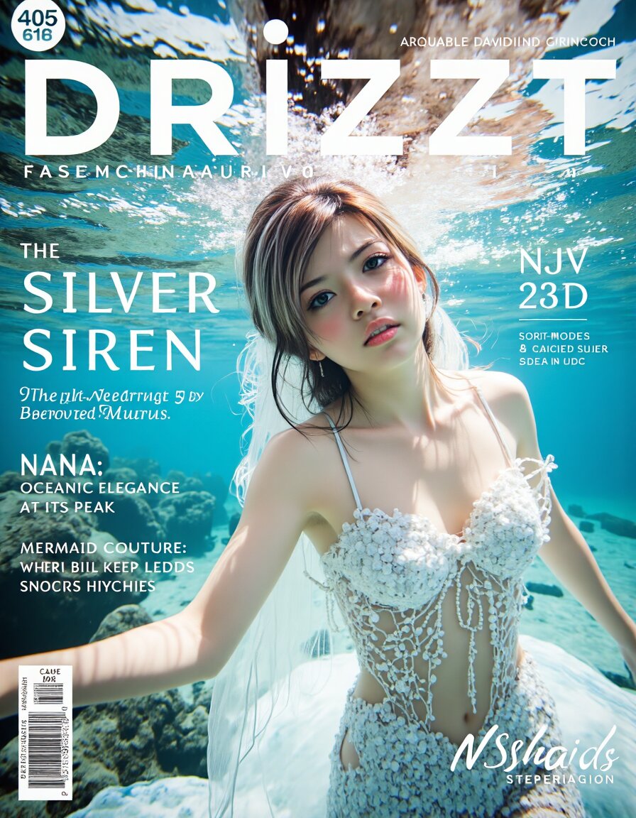 nana680228,(Cover of a magazine called “Drizzt”:1.2) with a photo below,a stunning mermaid with shimmering silver scales and deep blue eyes,floats gracefully beneath the surface of a crystal-clear ocean. Her gown,crafted from iridescent seaweed and pearls,flows around her in a dazzling display of oceanic elegance blending seamlessly into the scales of her lower body which transition from her waist down to her fish-like tail. The gown hugs her figure,and her long silver hair fans out around her. Her posture is serene,with her mermaid tail gently swaying by her side. one hand reaching out as if beckoning to the viewer,her eyes filled with mystery and allure. The lighting from above casts a beautiful,dappled effect on her scales,making her appear otherworldly. The photo includes the Text "Mermaid Couture: 'Nana' The Silver Siren" on the left side. Drizzt is presented in a soft,ocean-blue font,Clean Minimal Fonts,<lora:nana680228:1>,<lora:midjourney_whisper_innocent_eyes_v01:0.8>,<lora:ImageUpgraderV2:0.3>,detailmaximizer,<lora:mermaid_fish:0.98>,<lora:style_of_underwater_sea_life_FLUX_341:0.1>,