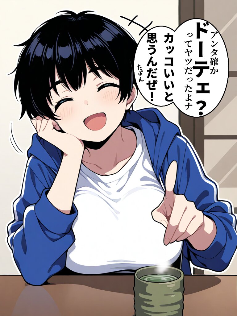 1girl,tomboy,(large breasts),slim,curvy,black hair,short hair,tareme,closed eyes,black eyebrows,light-smile,open mouth,blue hooded jacket,open jacket,white T-shirt,laughing,pointing at viewer,elbow on table,elbow rest,head rest,steam,yunomi on table,motion blur,motion lines,motion trail,white outline,white background,hair shade,upper body,from front,straight-on,((high contrast)),(stylized),(kawaii),(anime coloring),(cute),gddw,((correct_anatomy)),flat color