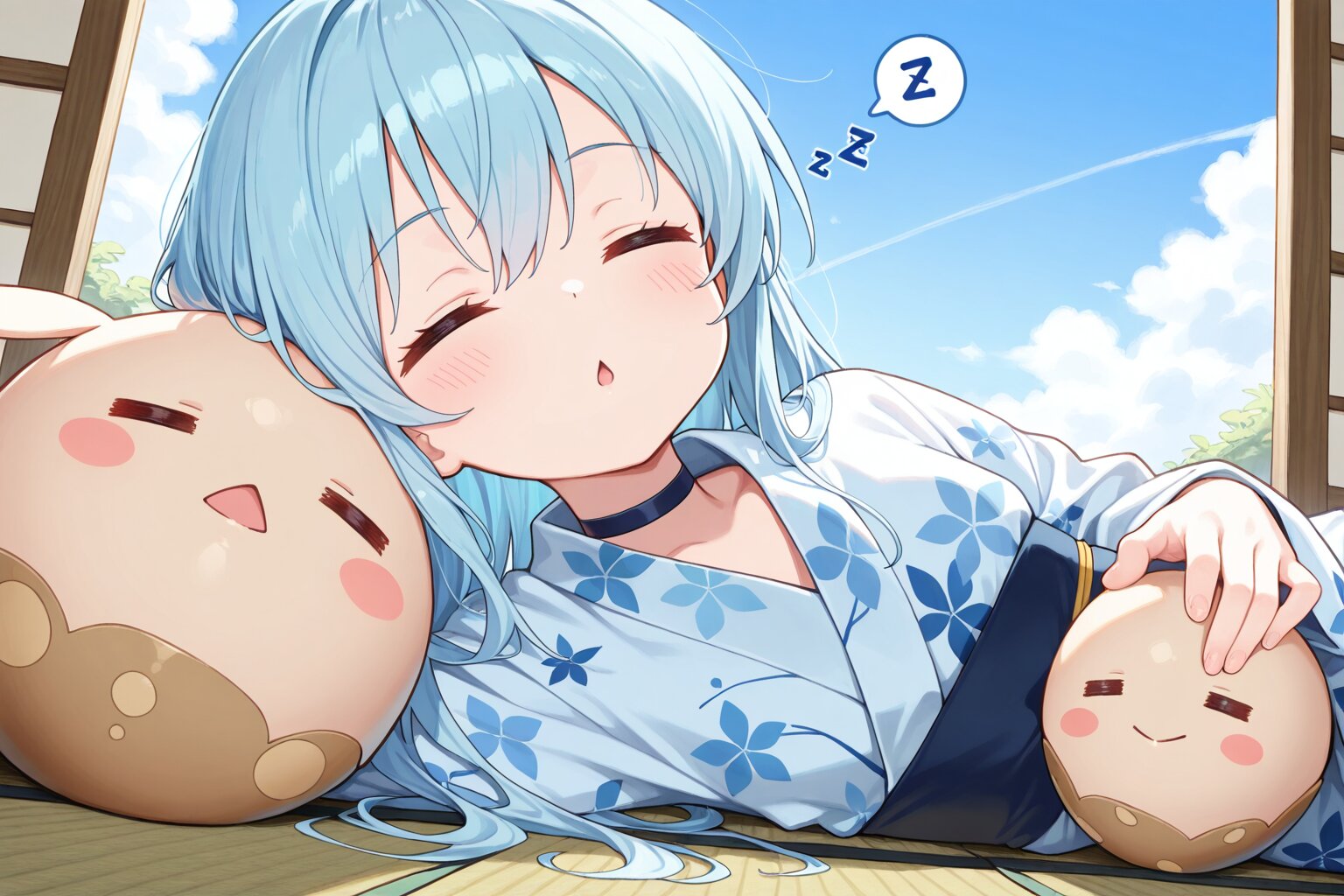 1 little girl, solo, upper body, diagonal angle, masterpiece, best quality, amazing quality, very aesthetic, sky blue hair, long hair, =_=, chestnut mouth, smile, cheerful, zzz, spoken zzz, choker, yukata, lying, sleeping, holding humpty dumpty, =_=, tatami,