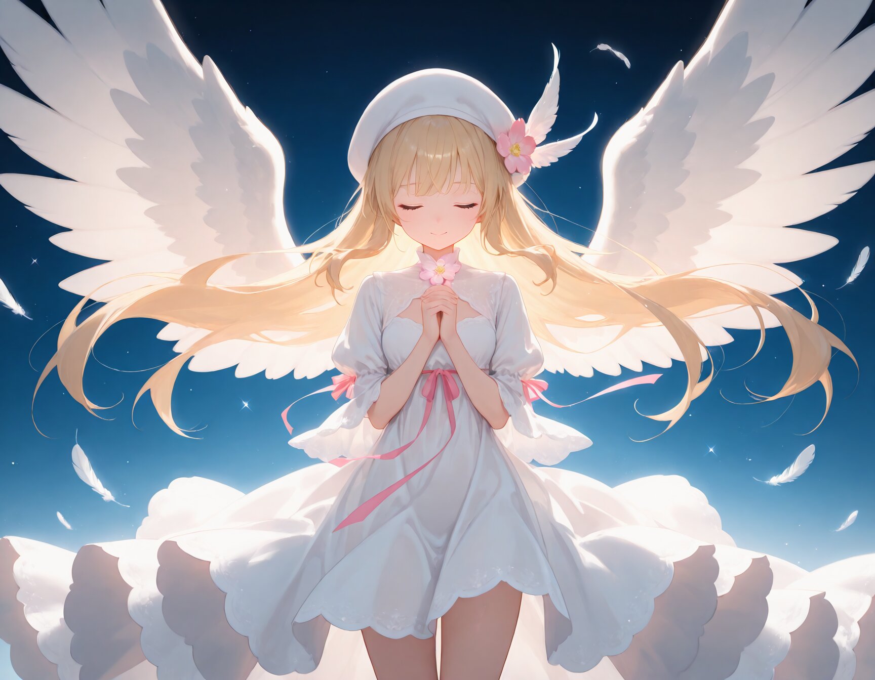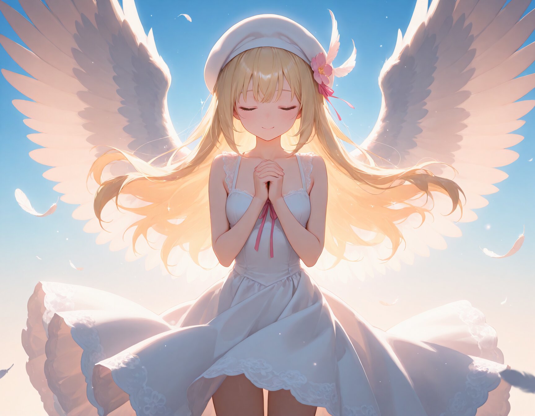 1girl,solo,20yo,fair_skin,slender,blue eyes,oval face,blonde hair,very long hair,small_breasts,white wings,big wings,white dress,pink ribbon,white flower ornament,lace,white hat,hat pink flower ornament,lace, standing,cowboy shot,floating hair,praying,closed mouth,smile,fantasy,soft lighting,sparkles,floating feathers, blue sky,same clowds,lighting particle,lighting behind,Pale atmosphere,facing viewer,(see-through silhouette:0.4),Tyndall Phenomenon,cinematic shadow,beautiful,beautiful eyes,, appropriate posture,appropriate configuration,ideal ratio body proportions,perfect anatomy, <lora:Fixhands_anime_bdsqlsz_V1:1>, masterpiece,best quality,newest,absurdres,highres,ultra high res,8K UHD,hyper-detailed,