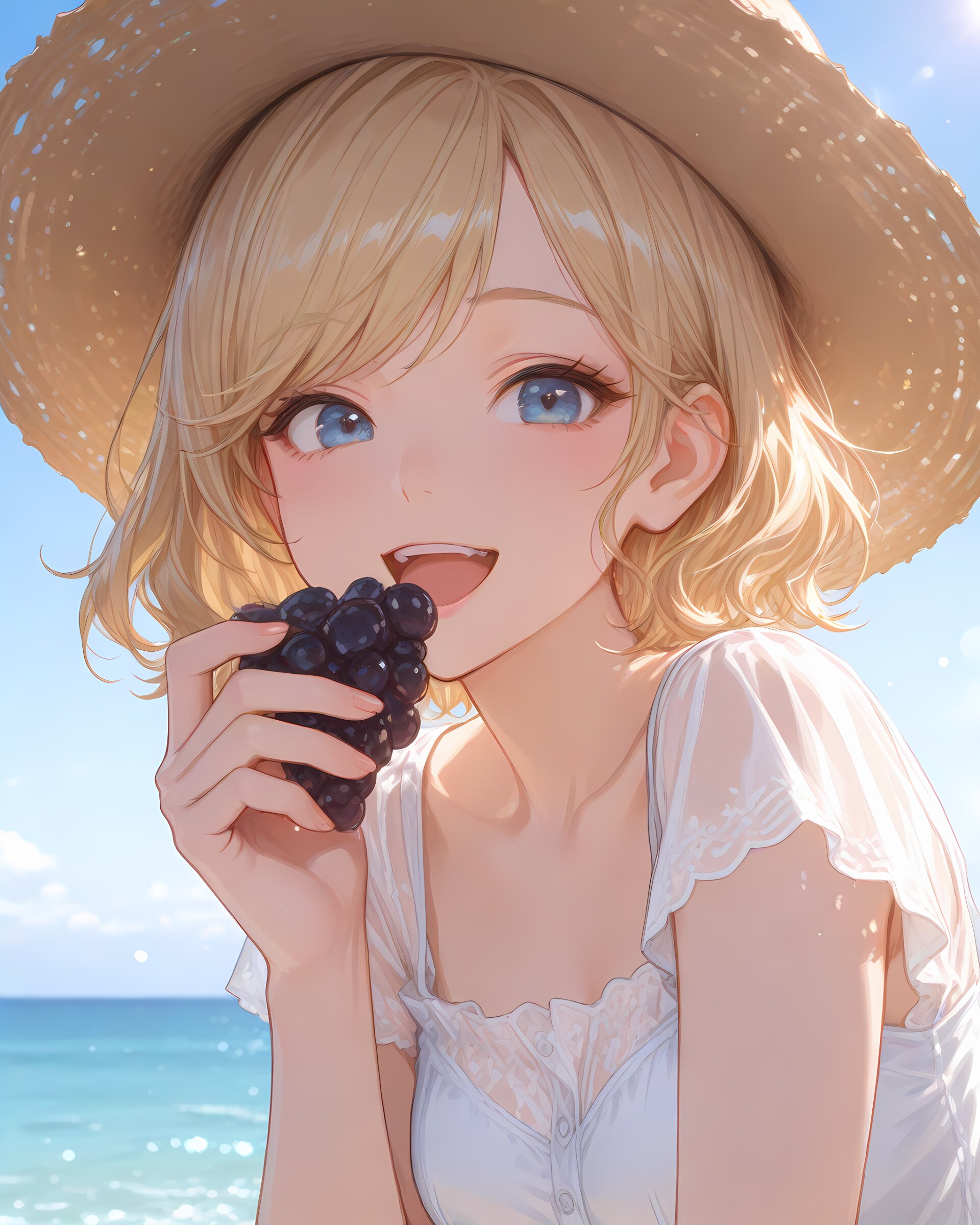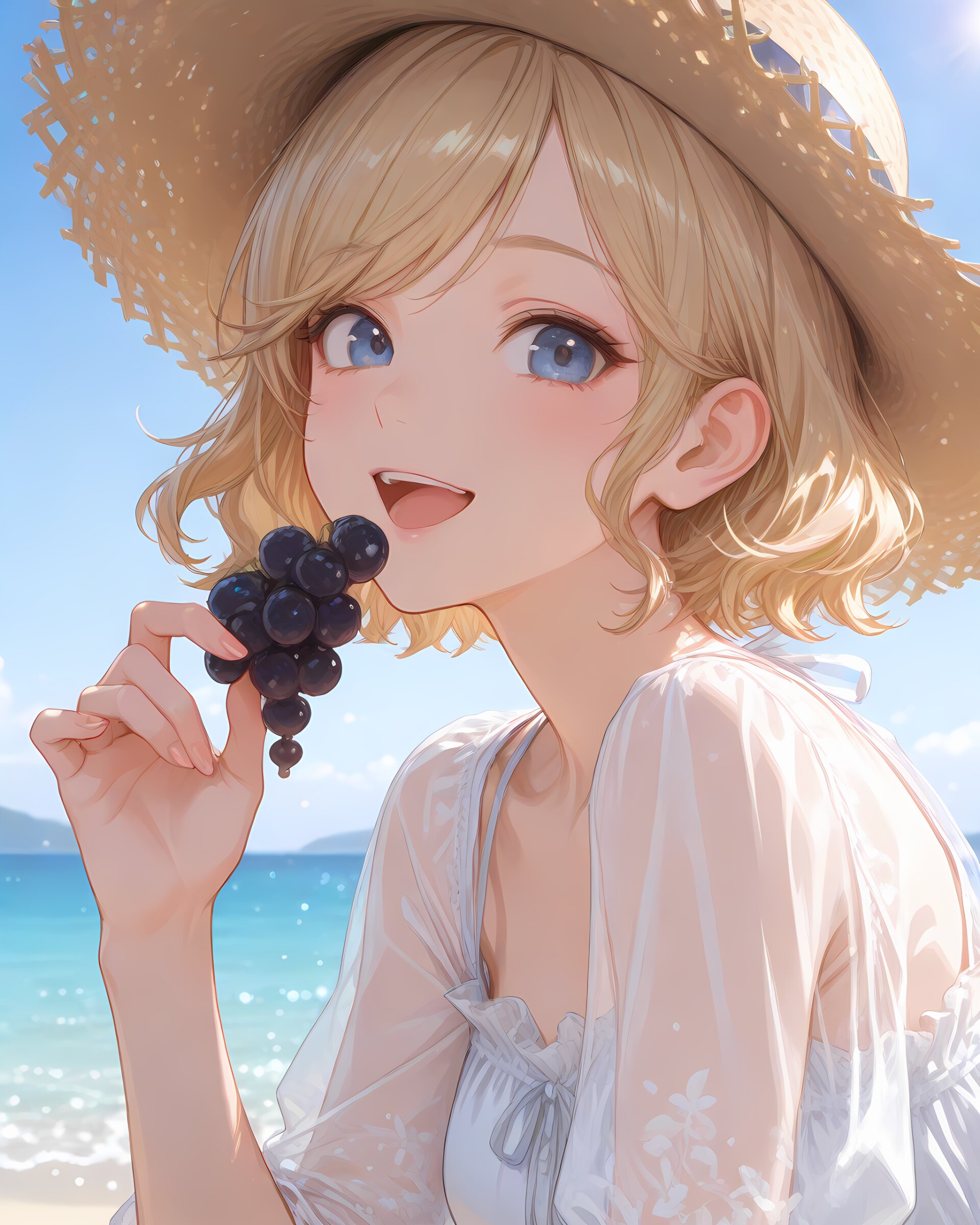 <lora:hyper_sdxl_8_step_lora_f16:1>,, 1girl, eating grape fruit, sea side, day, lens flare, focus face, close up, BREAK 18 years old, girl, short hair, wavy blonde hair, swept bangs, medium breasts, slender, frosty blue eyes, see through jacket, sleeveless tank top sundress, smile, hat, happy, open mouth, BREAK masterpiece, amazing quality, best quality, very aesthetic, ultra-detailed, 8K,