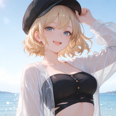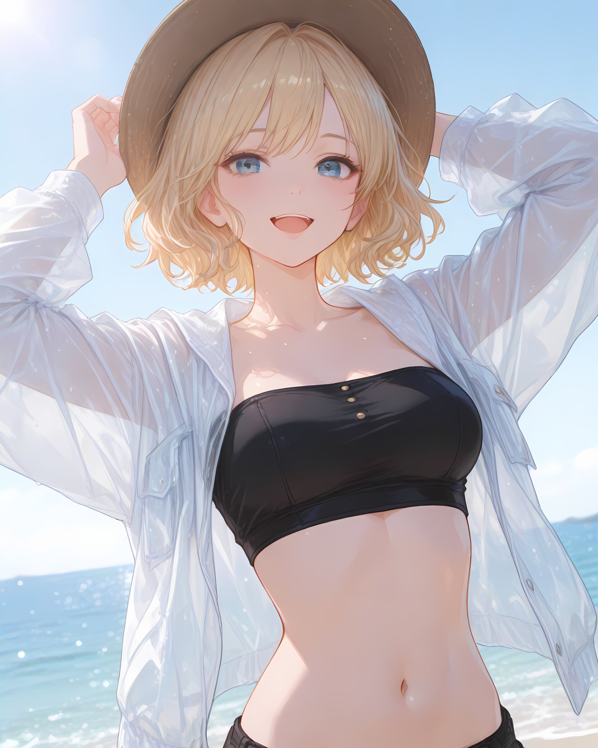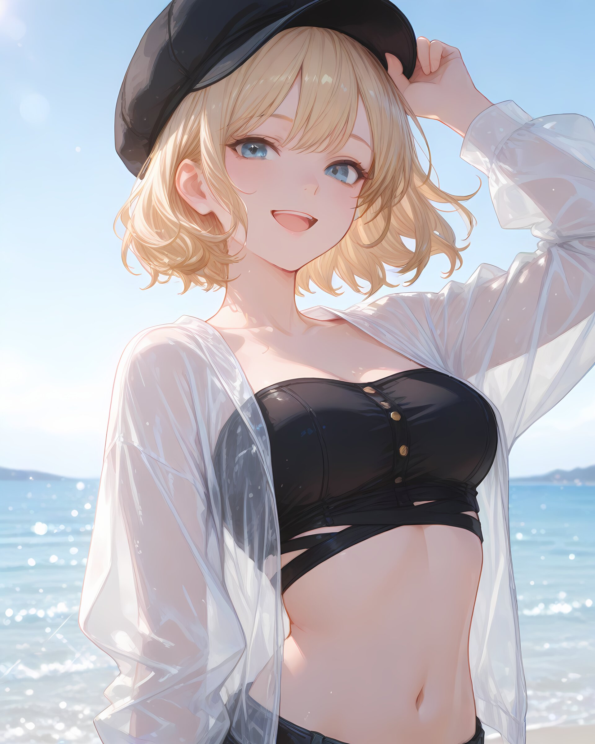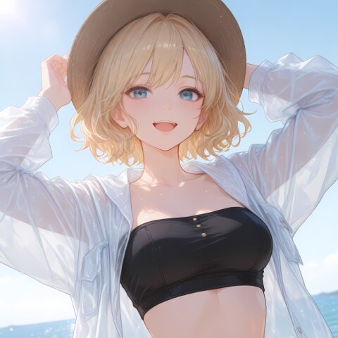 <lora:hyper_sdxl_8_step_lora_f16:1>,, 1girl, travel, sea side, day, lens flare, focus face, close up, BREAK 18 years old, girl, short hair, wavy blonde hair, swept bangs, medium breasts, slender, frosty blue eyes, see through jacket, navel, black tube top, l smile, hat, happy, open mouth, BREAK masterpiece, amazing quality, best quality, very aesthetic, ultra-detailed, 8K,