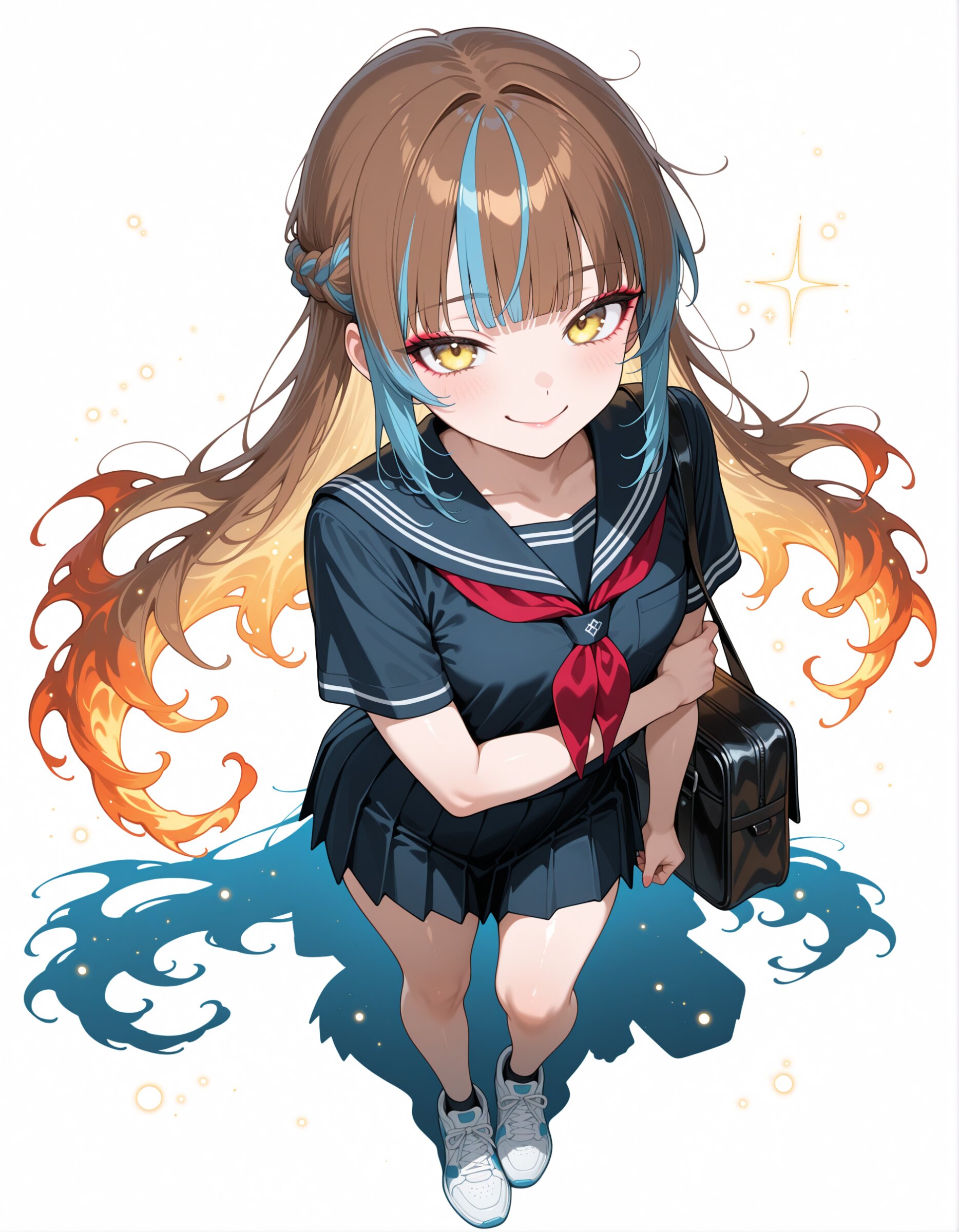 (fisheye,fisheye lens angle:1.0), (from above,looking up:1.2) looking at viewer, Line art is drawn in a warm brown tone instead of black. The outlines have a soft, earthy feel, adding a gentle and nostalgic atmosphere to the illustration. 1gyaru, beautiful detailed eyes, cute face, cool, light skin, skindentation, beautiful buttercup yellow eyes, , , two-tone hair, lightgray and cerulean blue hair cute, prehensile hair, french braid cut bangs , messy hair, first-rate female body perfect body beautiful small breasts, tone hips, makeup, , warm comfy flattered expression, gratified, pleased, complimented gently smile and thinking and smirk, seductive smile black serafuku, short sleeves, neckerchief , long plated skirt, , sneakers , a school bag (shy smile:1.0), (simple white background:1.0), drop shadow, transparent background holding own arm, walking, contrapposto masterpiece, best quality, amazing quality, very aesthetic, absurdres, newest, you can add scenery, (volumetric lighting), To make the background more distinctive. professional art lots of details, , overexposure, shiny-glistening, (watercolor style:0.0), (pastel color style:0.0) 4ur4_illu,shiny, glowing, glowing particles, glowing light particles, light particles, flame scarlet, <lora:noline (1):-0.5> <lora:sdxl2-flat2-512b:0.2> <lora:facelightup_xl_v10:0.5> <lora:V2_yakumo_alchemy:0.5> <lora:Aura_illu:0.1>