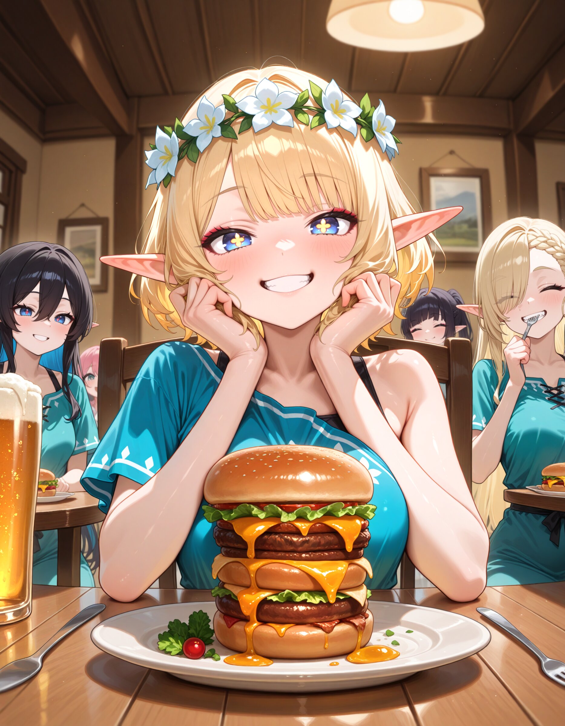 multiple girls, 4girls, (elf girls:1.2), , having a drinking party at a restaurant. (The restaurant’s interior features a chic style chic A black mantelpiece black holds a mirror resting on it and art leaning against the wall,The restaurant’s interior capitalizes on the natural warmth of wood (natural warmth:1.0) The counter seats are crafted for a relaxing experience (relaxing experience:1.0) A meticulous approach to the ambiance and lighting ensures that quality time flows within (meticulous approach:1.0) quality time flows,The restaurant’s interior boasts an upscale ambiance fantasy modern art and wall panels fantasy modern contribute to a fantasy aesthetic atmosphere fantsy aesthetic This setting exudes a dignified elegance dignified elegance, resonating with a distinct fantasy character:1.0). Please show their joyous expressions and the sense of camaraderie between them,, (noon:1.0), soft natural sunlight, ((portrait:1.0), cheek-to-cheek:1.1), , (low angle shot:1.0), pinhole lens, , perfect anatomy, , with fork ,spoon, , eating bacon, fried egg, toast on plate, burger on plate, , sliced bread brown stew, professional anime art lots of details, , overexposure, shiny-glistening, (watercolor style:0.8), (pastel color style:1.3) you can add scenery, (volumetric lighting), To make the background more distinctive. super fine concept art, hard surface, 8K, unreal engine, masterpiece, best quality, amazing quality, very aesthetic, absurdres, newest, ambient occlusion, raytracing, <lora:noline (1):-0.5> <lora:sdxl2-flat2-512b:0.0> <lora:facelightup_xl_v10:0.5> ((portrait:1.0), cheek-to-cheek:1.1), , (low angle shot:1.0), pinhole lens beautiful elf girls sitting on dining chair,(glossy skin:1.0), extra long hair, senegalese twists hair over eyes , , insanely beautiful royalblue eyes, first-rate female bodies, voluptuous body, flat breasts, small hips, (embarrassed:1.0), (drunkard, happy:1.2), red pupils, eyeshadow, pout, 文字数制限により省略