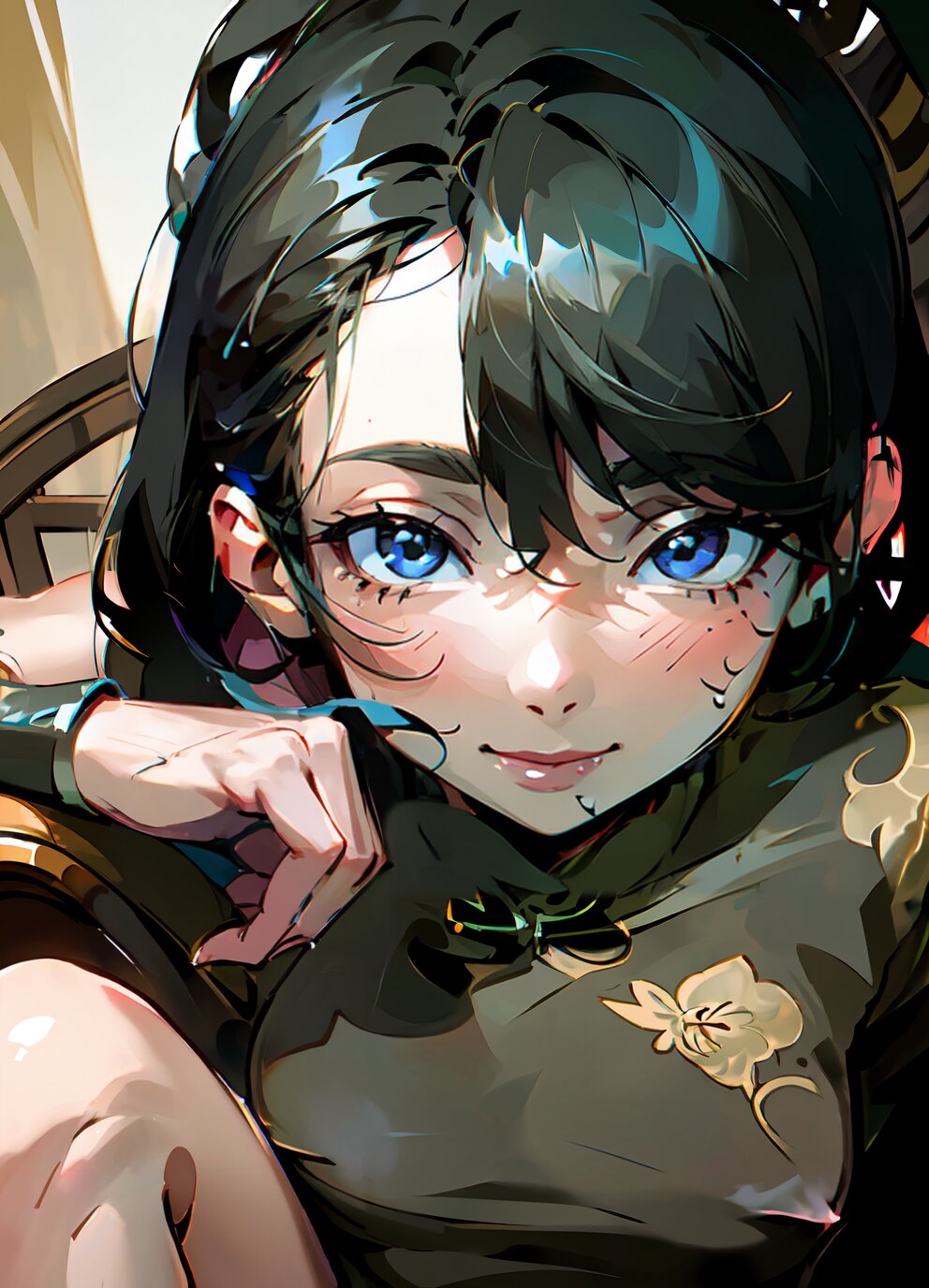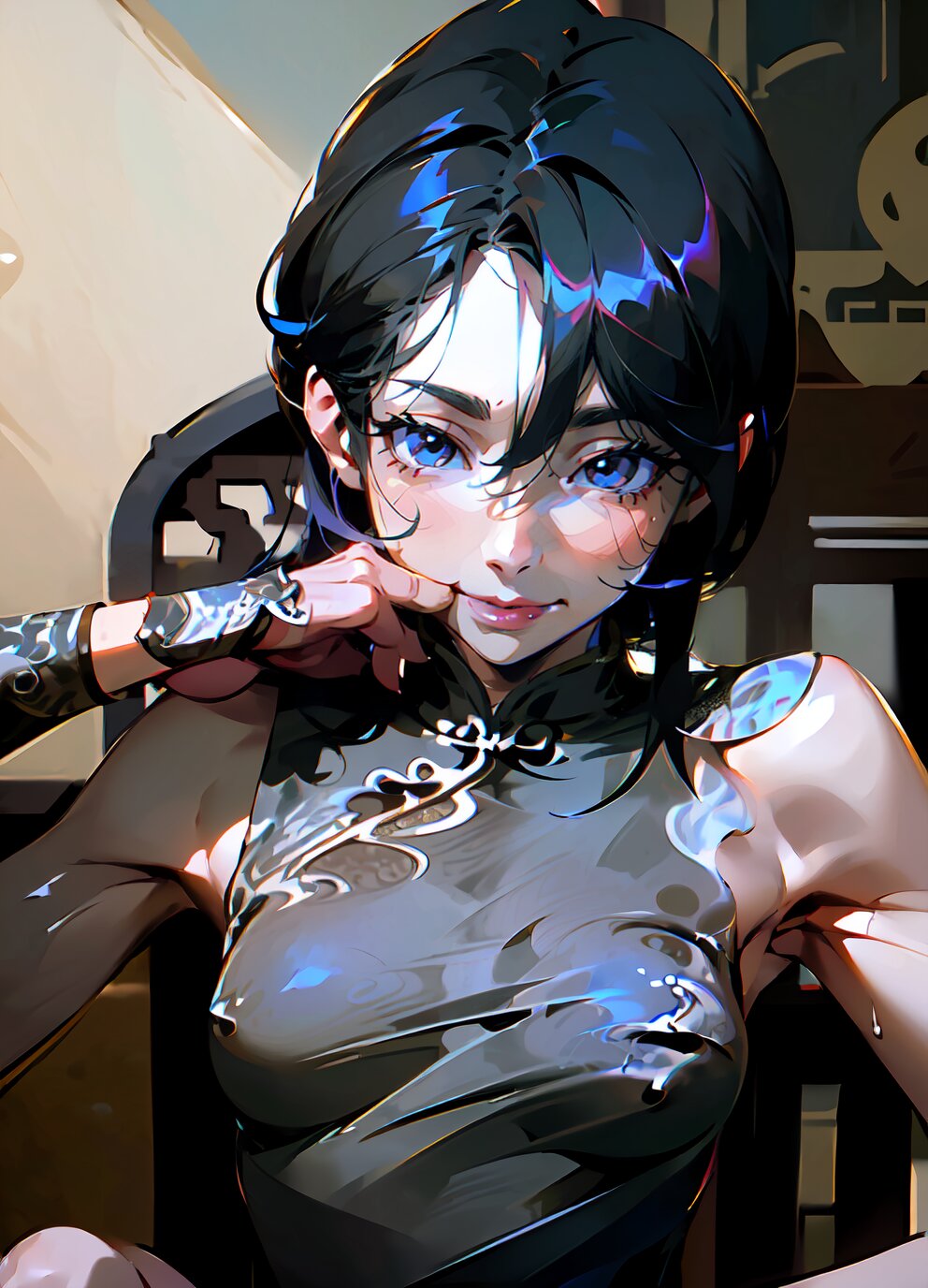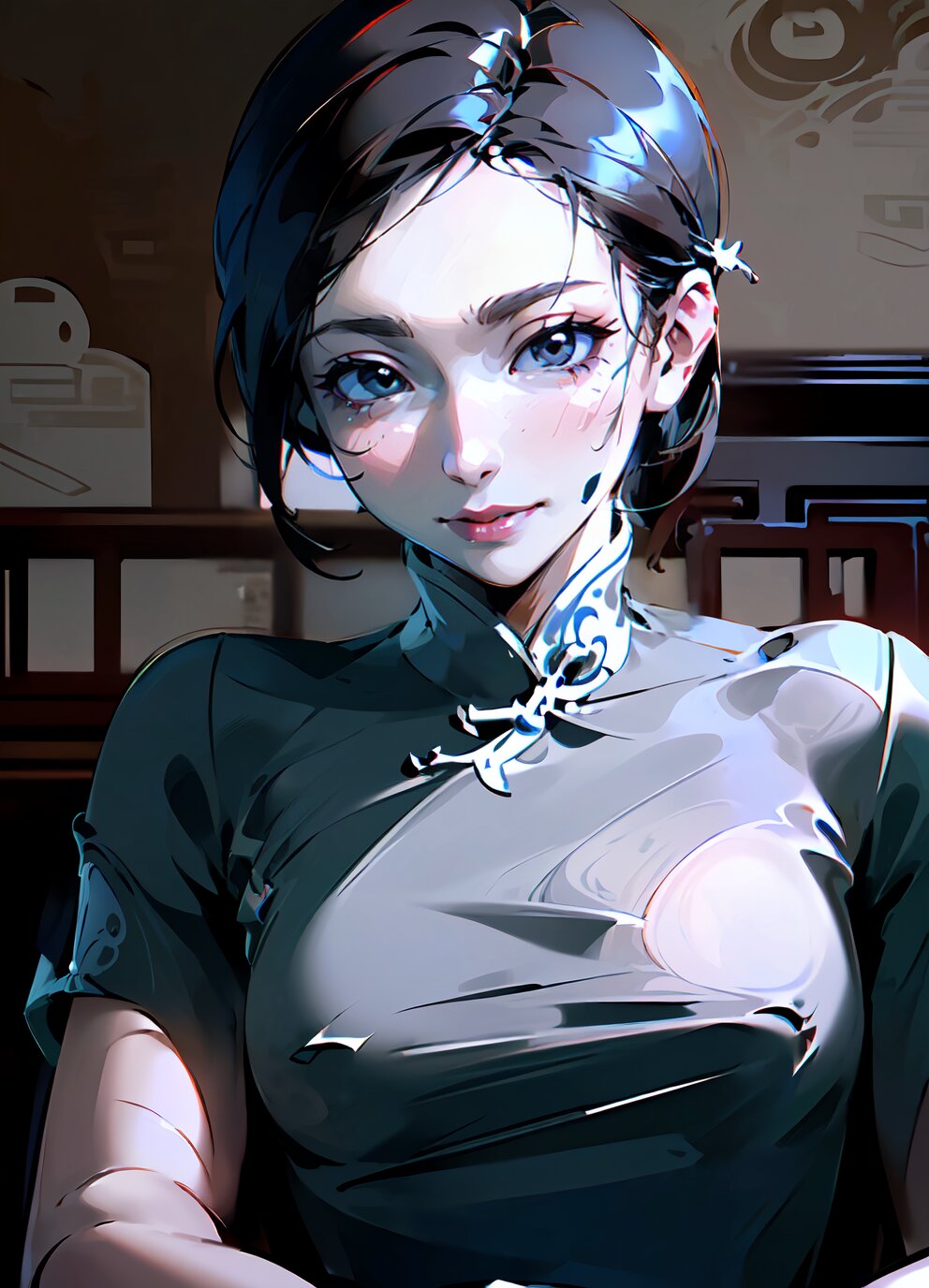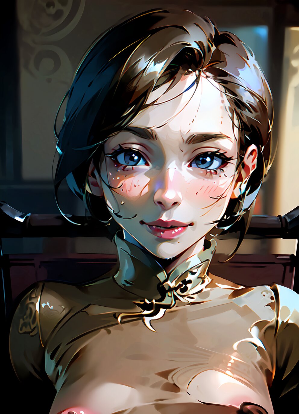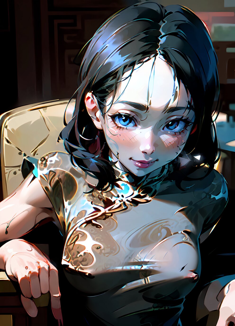 (nsfw: 1.4), (upper body, closeup face: 1.6), (8k, best quality, masterpiece:1.4), (realistic, photo-realistic:1.6), HDR, (incredibly absurdres:1.2), (vibrant color:1.2), ultra-detailed, 1woman, solo, 52 years old, (slender, small breasts: 1.4), medium hair, perfect body, highly detailed, looking at viewer, (sexy china dress: 1.8), (sitting on chair: 1.6), in the bedroom, <lora:shihori_v01:1>