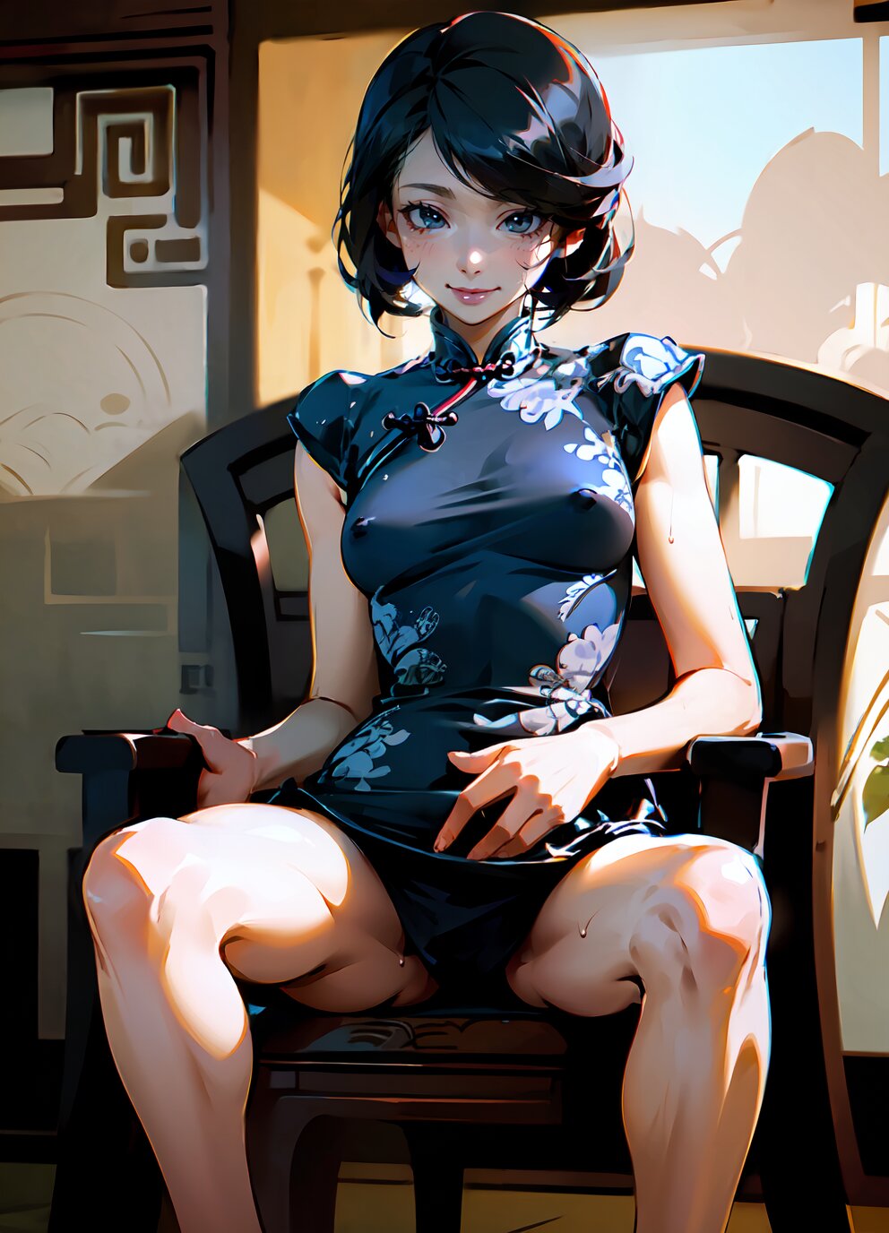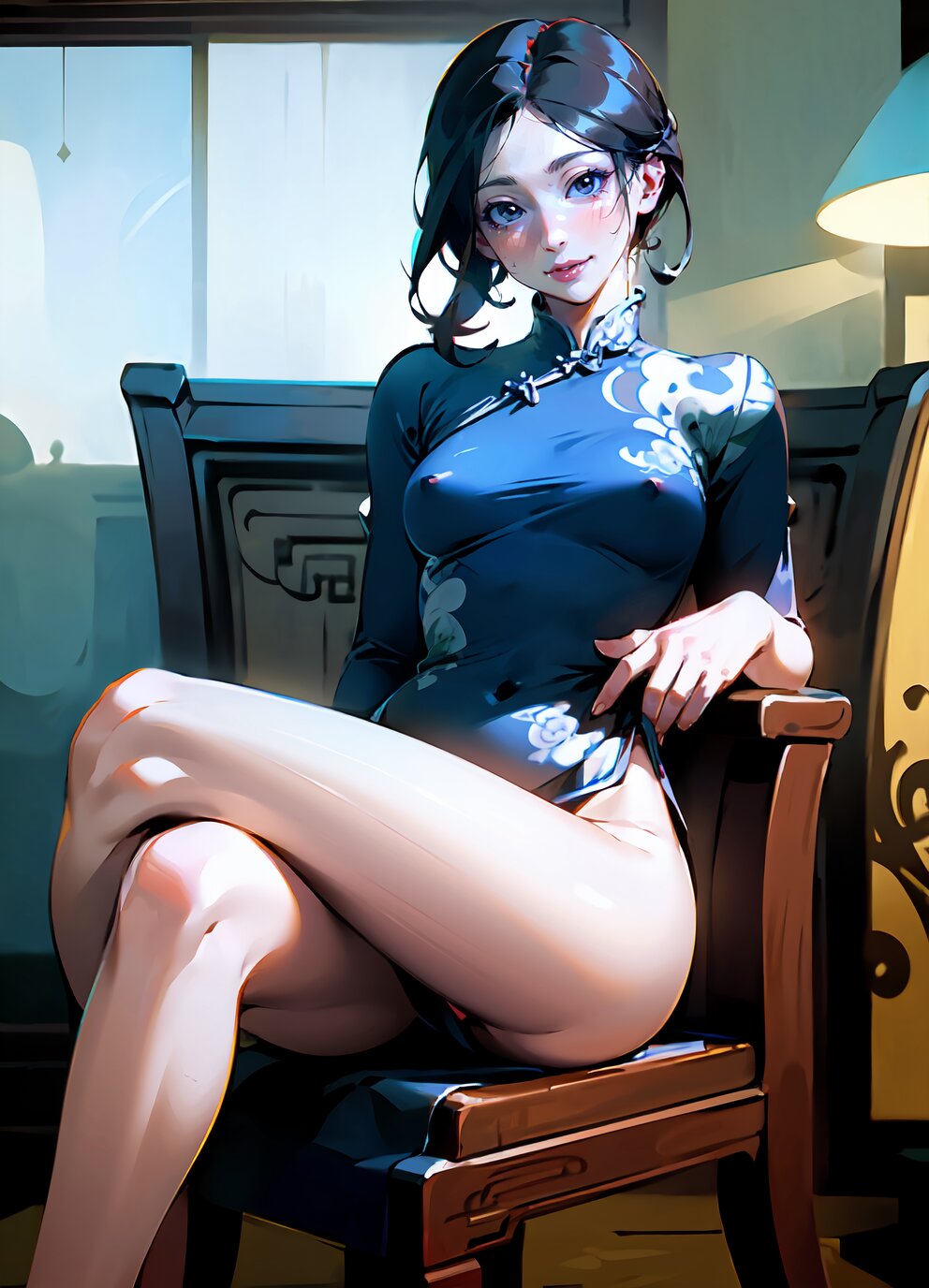 (nsfw: 1.4), (full body, from below: 1.2), (8k, best quality, masterpiece:1.4), (realistic, photo-realistic:1.6), HDR, (incredibly absurdres:1.2), (vibrant color:1.2), ultra-detailed, 1woman, solo, 52 years old, (slender, small breasts: 1.4), medium hair, perfect body, highly detailed, looking at viewer, (sexy china dress: 1.8), (sitting on chair, wide spreading legs: 1.6), in the bedroom, <lora:shihori_v01:1>