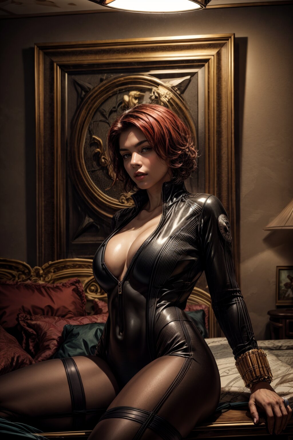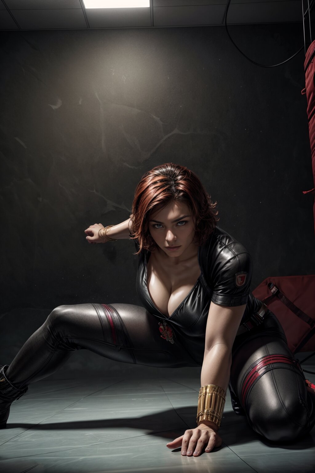 (realistic:1.3),finely detailed,quality,rembrandt lighting,(masterpiece:1.2),(photorealistic:1.2),(best quality),(detailed skin:1.3),(intricate details),dramatic,ray tracing BREAK 1girl,blkwidow,21 years old,detailed skin texture,slender body,curvey,subsurface scattering,medium breasts,red hair,(short hair),(wearing black bodysuit,cleavage,black belt:1.2),(fighting pose),<lora:blackwidow-nvwls-v1:1>,(proud mood),full body,