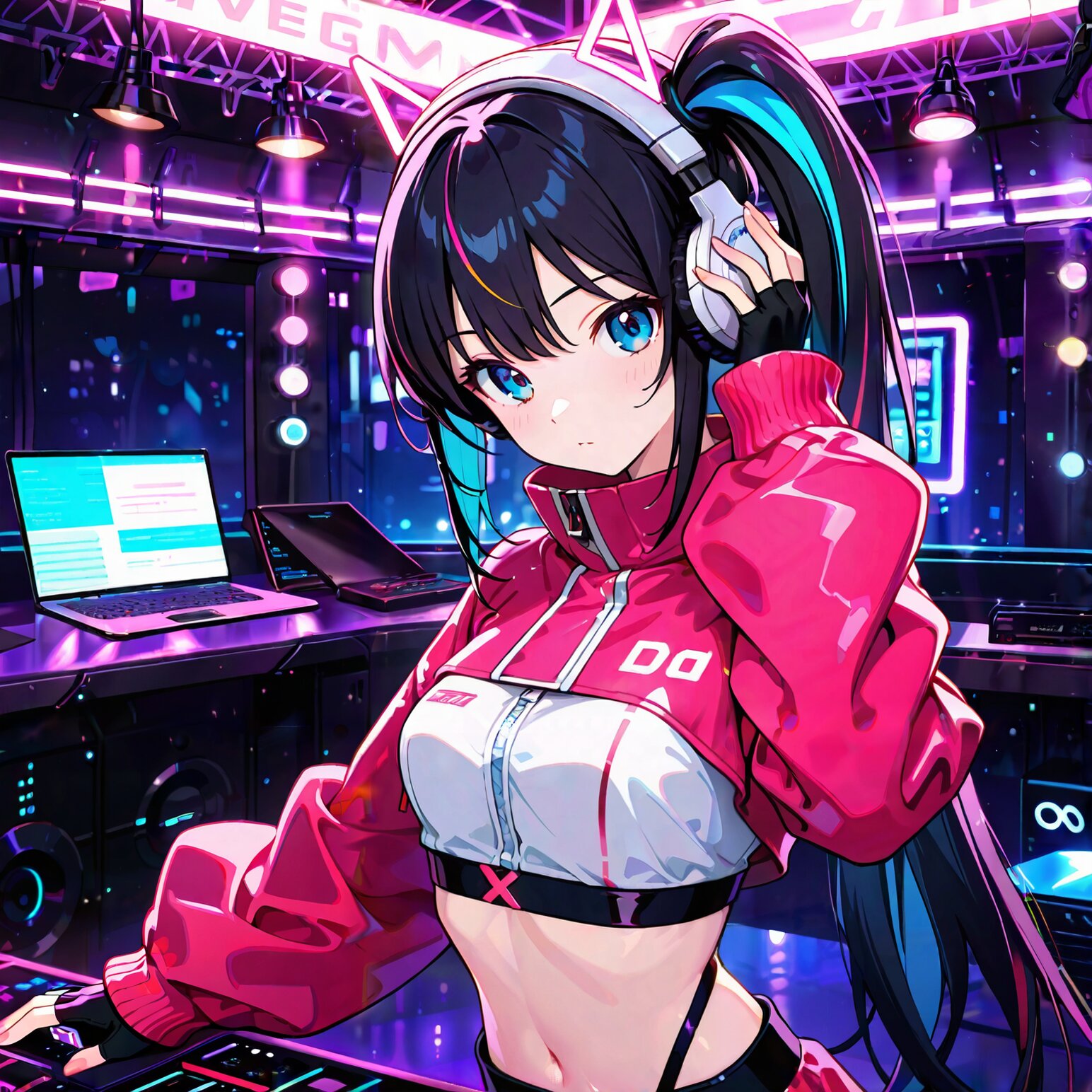 1girl, young, cool girl, solo, confident expression, techno fashion, bust shot, looking at viewer, one hand on headphone, other hand on mixer, standing, headphones, crop top, fingerless gloves, blue eyes, side ponytail, long hair, colored highlights, dj booth, laptop, club interior, neon lighting, rim light, stage light, glow effect, ambient light, flashing lights, music producer, electronic music, masterpiece, best quality, highres, absurdres, amazing quality,