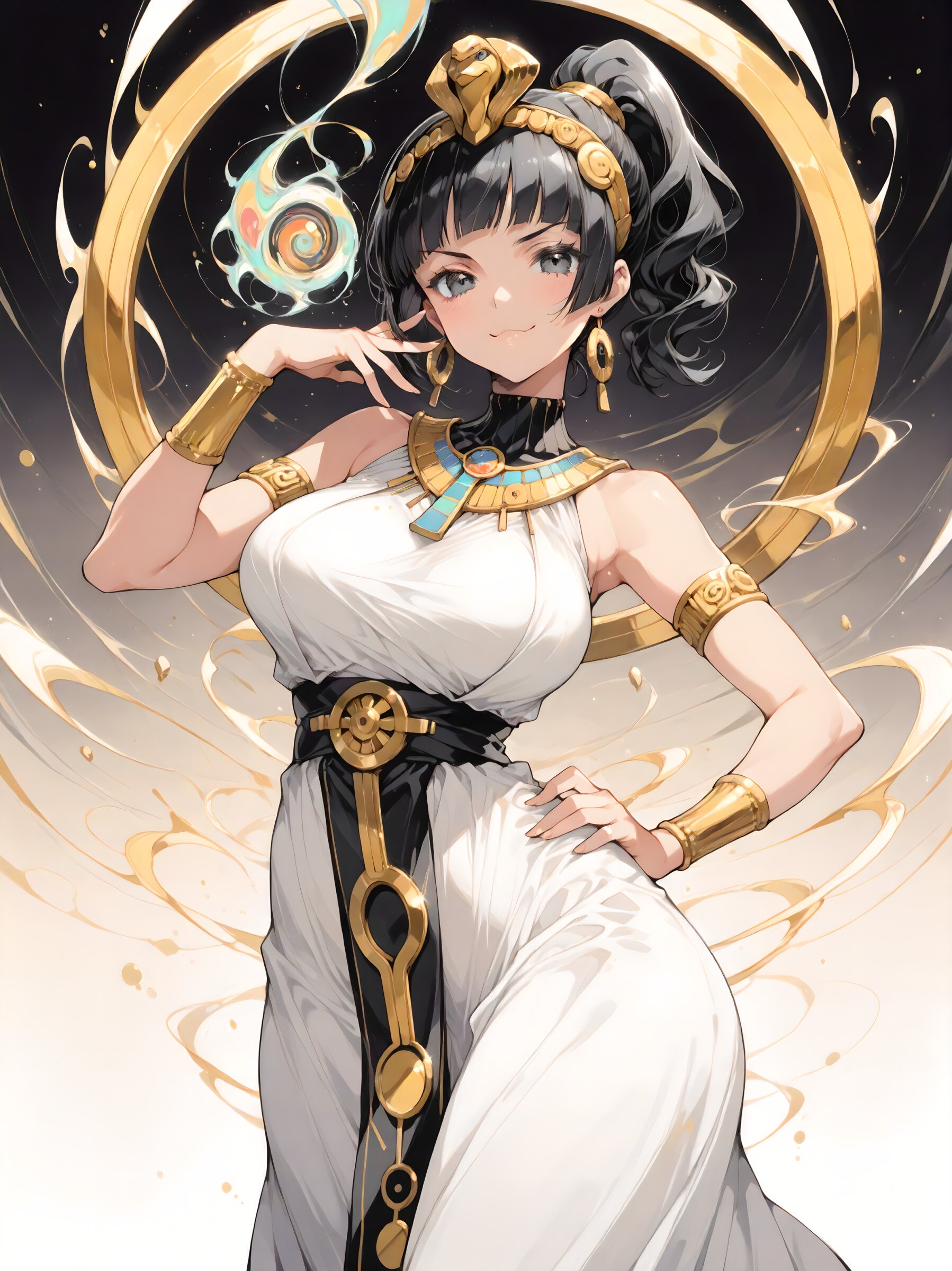 Best quality, Masterpieces, simple background, lots of negative space, anime-style illustration, solo, (young girl), cute face and eyes, big breasts, black hair, clear black eyes, single short ponytail hair, cute and lovely, Vigorous, lively, and spontaneous personality, cleopatra costume, egyptian clothes, jojo pose, cinematic angle, sound effects, smug, one hand on hip, abstract swirling energy background, soft spirals, minimal, dynamic yet serene, Ancient Egypt,
