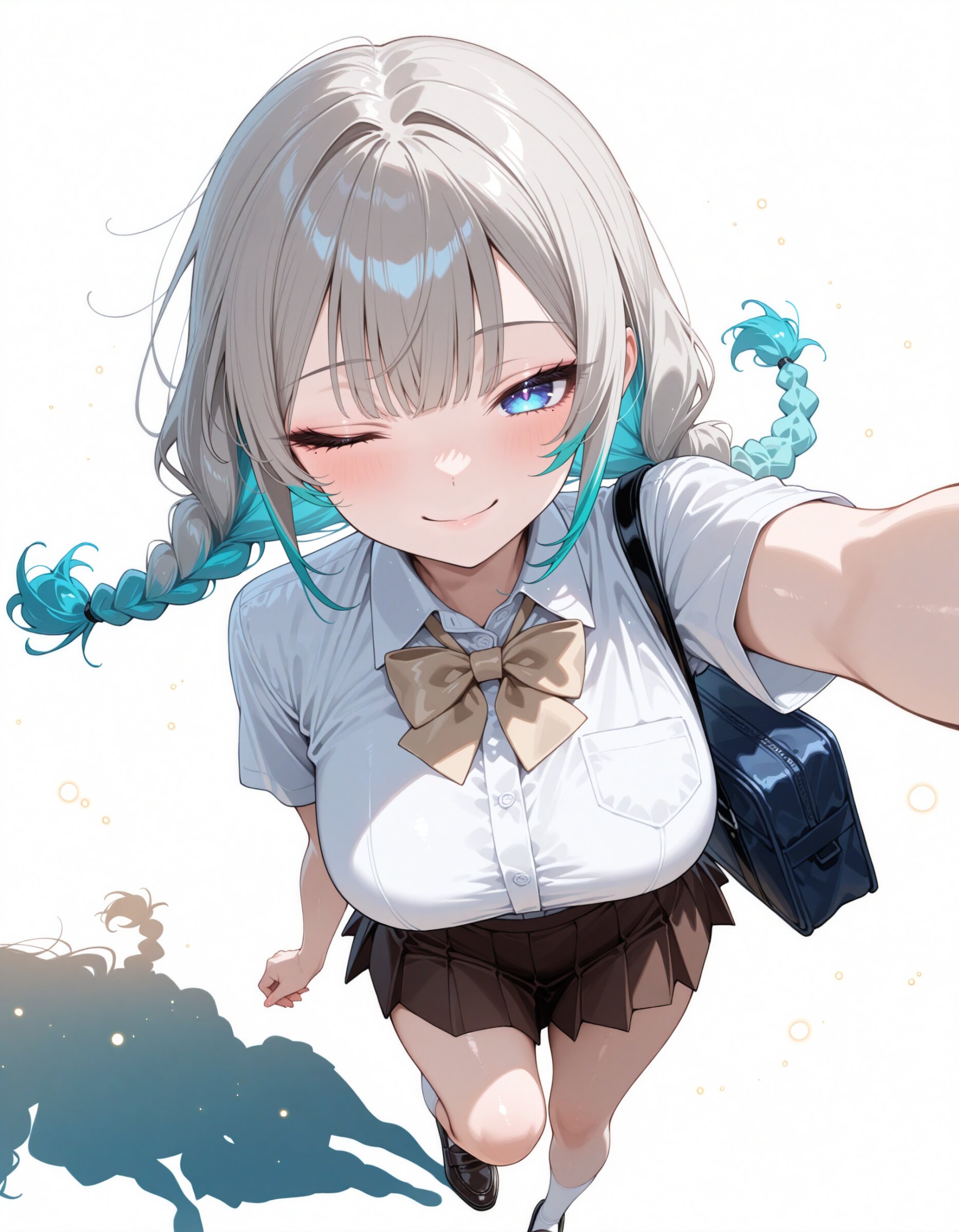 (fisheye,fisheye lens angle:1.0), focus breast looking at viewer, Line art is drawn in a warm brown tone instead of black. The outlines have a soft, earthy feel, adding a gentle and nostalgic atmosphere to the illustration. 1girl, beautiful detailed eyes, cute face, cool, redness skin, skindentation, beautiful deep skyblue eyes, , , multicolored hair, cobalt green,blue,maroon,grey hair cute, shoulder length hair, tri braids center-flap bangs , floating hair, first-rate female body perfect body beautiful big breasts, tone hips,, warm comfy coy expression, flirtatious, playful, teasing light smile and one eye closed, seductive smile beige bowtie, white collared shirt, short sleeves, short plated skirt, , loafers , a school bag (naughty face,seductive smile:1.2), (simple white background:1.0), drop shadow, transparent background reaching towards viewer, walking, knee up masterpiece, best quality, amazing quality, very aesthetic, absurdres, newest, you can add scenery, (volumetric lighting), To make the background more distinctive. professional art lots of details, , overexposure, shiny-glistening, (watercolor style:1.0), (pastel color style:0.0) 4ur4_illu,shiny, glowing, glowing particles, glowing light particles, light particles, flame beige, <lora:noline (1):-0.5> <lora:sdxl2-flat2-512b:0.15> <lora:facelightup_xl_v10:0.5> <lora:V2_yakumo_alchemy:0.5> <lora:Aura_illu:0.1>
