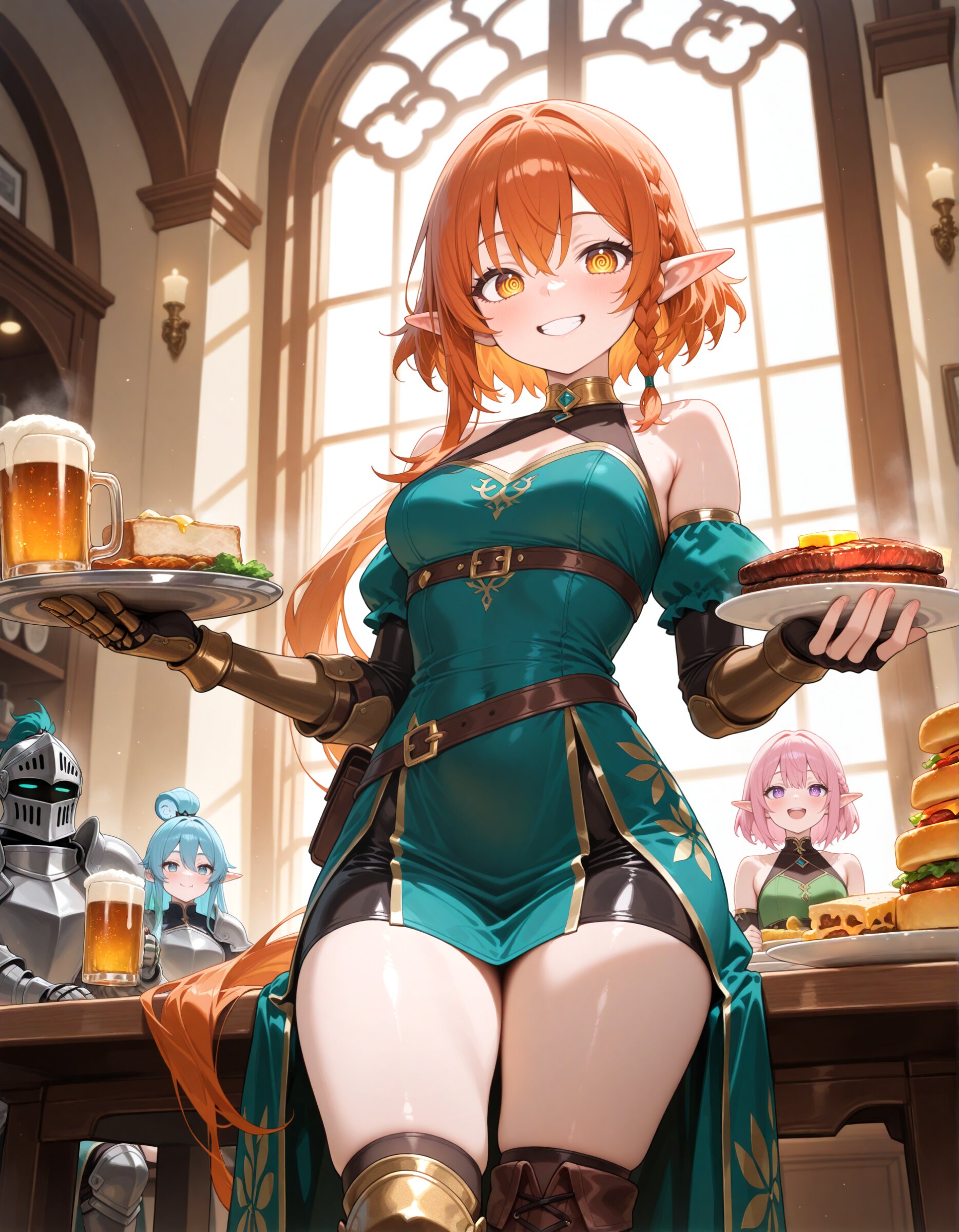 multiple girls, 4girls, (elf girls:1.2), , having a drinking party at a restaurant. (In addition to tables, the restaurant offers a well-appointed counter (well-appointed:1.0), making it comfortable for solo diners (suitable for solo lunch:1.0) The decor is unified in a wood theme (wood:1.0), creating an interior that shines with an antique yet high-sense style antique yet high-sense,The restaurant’s interior capitalizes on the natural warmth of wood (natural warmth:1.0) The counter seats are crafted for a relaxing experience (relaxing experience:1.0) A meticulous approach to the ambiance and lighting ensures that quality time flows within (meticulous approach:1.0) quality time flows,The restaurant’s interior features a chic style chic A black mantelpiece black holds a mirror resting on it and art leaning against the wall:1.0). Please show their joyous expressions and the sense of camaraderie between them,, (noon:1.0), soft natural sunlight, (cowboy shot:1.1), , from below, , , perfect anatomy, , with fork ,spoon, , eating prawn salad on plate, steak and cheese sandwich on plate, , yorkshire pudding on plate, professional anime art lots of details, , overexposure, shiny-glistening, (watercolor style:1.0), (pastel color style:1.0) you can add scenery, (volumetric lighting), To make the background more distinctive. super fine concept art, hard surface, 8K, unreal engine, masterpiece, best quality, amazing quality, very aesthetic, absurdres, newest, ambient occlusion, raytracing, <lora:noline (1):-0.5> <lora:sdxl2-flat2-512b:0.15> <lora:facelightup_xl_v10:0.5> (cowboy shot:1.1), , from below, cool elf girls sitting on dinette chair,(pale skin:1.0), absurdly long hair, asymmetrical sidelocks widow's peak topknot skinny hair, insanely beautiful burnt sienna eyes, first-rate female bodies, voluptuous body, medium breasts, tone hips, (embarrassed:0.8), (drunkard, happy:0.8), cephalopod eyes, mouth hold, (shy smile:1.2), (knight:1.3), 文字数制限により省略