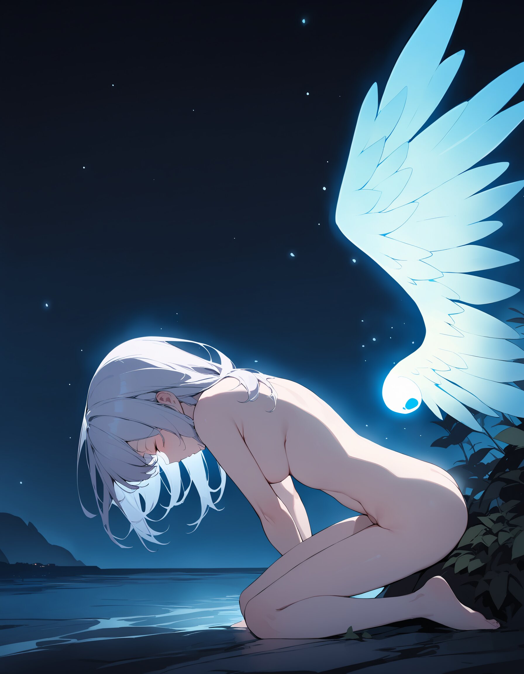nsfw, uncensored, 1girl, angel, closed eyes, completely nude, glowing wing, night, night sky, floating, fetal position, from side, masterpiece, great score, high score, absurdres