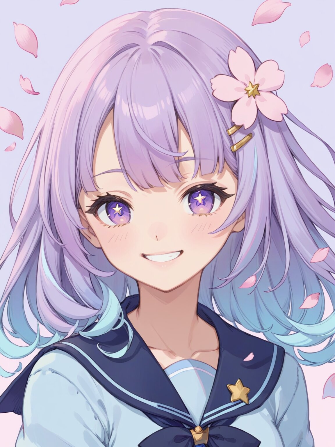masterpiece, best quality, solo, 1girl, extreme close-up, cute anime girl with bright smile, looking at viewer, large sparkling purple eyes, sailor uniform with white and navy blue color scheme, short silver hair, flower hair clip, sakura petals falling, soft pink and blue background, anime style, cel shading, sharp anime lineart, clean outlines, flat shading, pastel color palette, energetic mood, kawaii expression, 1girl, soft anime face, teenage, pastel purple hair, light blue inner hair, fluffy long hair, loosely wavy hair, soft flowing hair, straight-cut bangs, star-shaped hairpin, calm violet eyes, navy blue sailor uniform, light cardigan