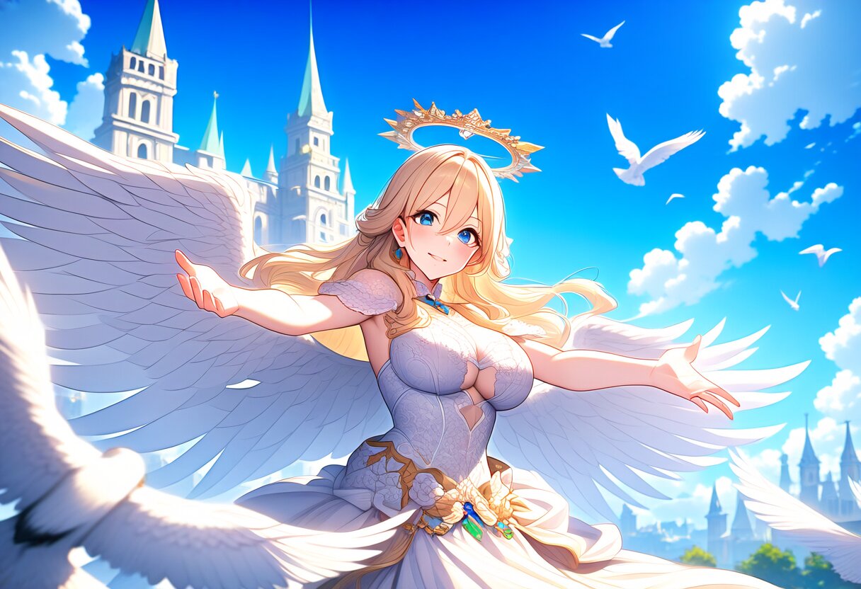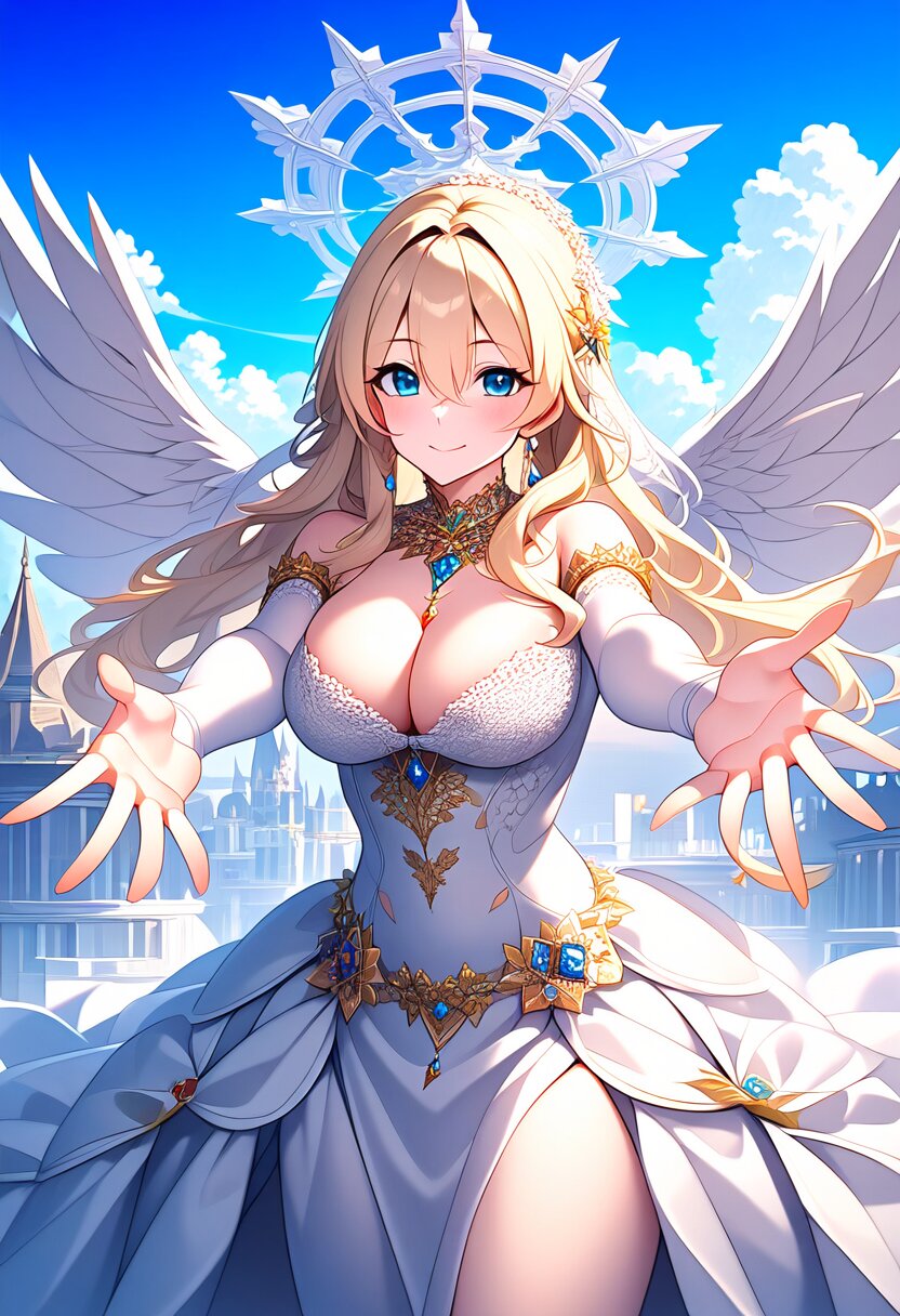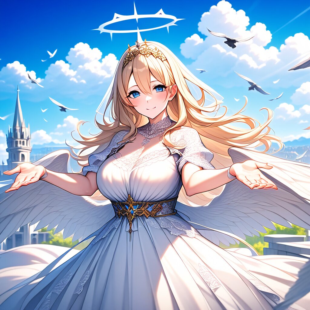 {{{masterpiece}}}, {{{best quality}}}, {{{very aesthetic}}}, {{{ultra-detailed}}}, {illustration}, {{{extremely detailed}}}, {{{an extremely delicate and beautiful}}}, {{{highly detailed}}}, {{official style}}, {{game cg}}, {{intricate}}, style of ai-generated, {{25 year old women}}, {{adult women}}, {{cygames style, princess connect!}}, 1girl, solo, blue eyes, long hair, blonde hair, hair between eyes, large breasts, {{smile}}, outstretched arms cowboy shot, {{princess white dress}}, {{the white wings of a crow are growing on its white}}, halo, blue sky, clouds, castle