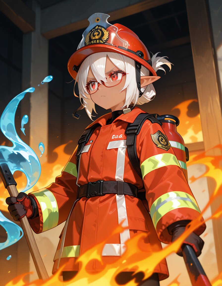 1girl, general, firefighter, fire conflagration, (beautiful eyes, detailed eyes), looking away, solo, cute, indoors, surround fire, cowboy shot, (dark skin, red-framed eyewear:1.2), white hair, folded ponytail, short hair, hair between eyes, flat chest, red eyes, elf, firefighter jacket, fire helmet, transparent, water, magic, annoyed, masterpiece, best quality, amazing quality,