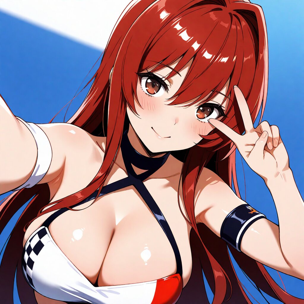 masterpiece,best quality,amazing quality,very aesthetic,absurdres,newest,okashirastyle,highres, 1girl,long_hair,brown_hair,red_eyes,hair_between_eyes,very_long_hair,brown_eyes,red_hair,floating_hair,hair_intakes,straight_hair,shiny_skin, race_queen_costume, selfie, v-sign, peace sign