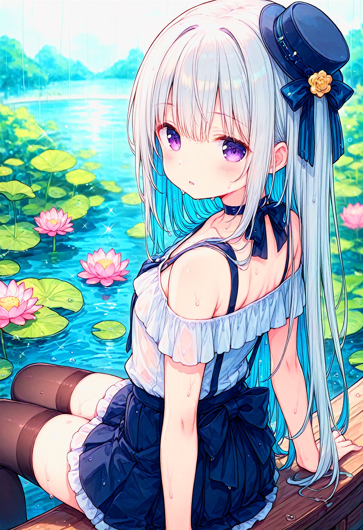 beautiful detailed background, best quality,( pale color,:0.8) scenery, detailed, intricate, watercolor \(medium\), solo, blue theme, depth of field, blurry background, collarbone, parted lips,(Expressionless:0.8), big eyes,(half-closed eyes:0.8), tareme, pale purple eyes, thighhighs, (silver hair:1.3), (dark blue hair colored inner hair:0.8), long hair,very long hair, eyebrows visible through hair, sparkle, (white off-shoulder) and (dark blue skirt,:1.2) see-through veil, mini hat, blue strapping ribbon and bow, frills, strapping ribbon, choker, temptation, see-through, water drop,, (water lily:1.2), outdoors, rain, wet clothes,wet hair,(rainbow:0.9), sitting,( looking back,:1.2) high angle, fisheye, particle lighting, <lora:noline-16oa:-0.8> <lora:sdxl-shadow_01:-0.9> <lora:sdxl2-flat2-512b:-0.75>,
