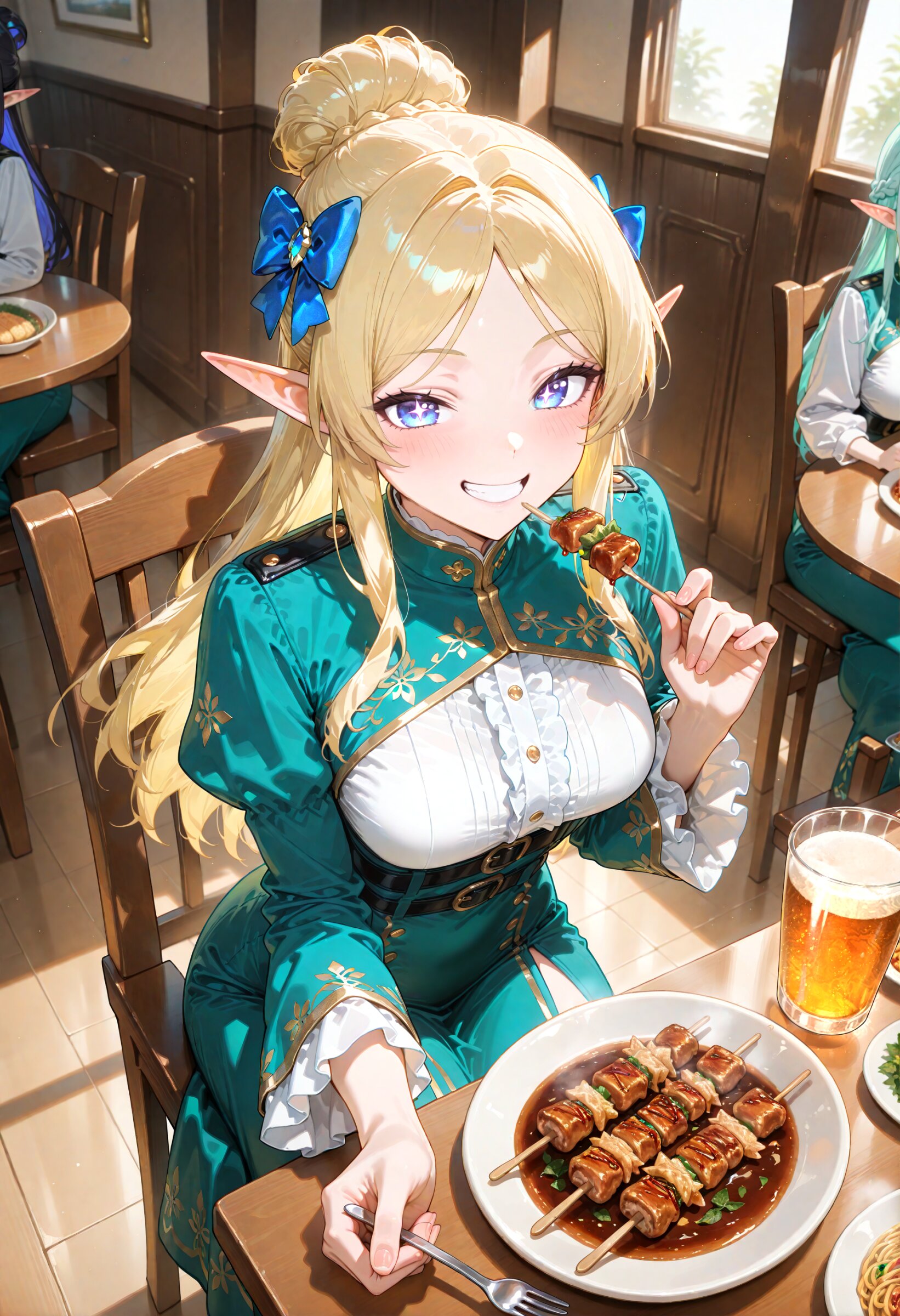 multiple girls, 4girls, (elf girls:1.2), , having a drinking party at a old japanese bar,. They are seated around a round table, drinking, chatting, and enjoying their food. Please show their joyous expressions and the sense of camaraderie between them, (noon:1.0), soft natural sunlight, (cowboy shot:1.1), , from above, Surveillance viewpoint, , perfect anatomy, , with chopsticks, spoon, , eating udon noodles on bowl, Yakitori on plate, , shrimp tempura on plate, professional anime art lots of details, , overexposure, shiny-glistening, (watercolor style:1.2), (pastel color style:1.2) you can add scenery, (volumetric lighting), To make the background more distinctive. super fine concept art, hard surface, 8K, unreal engine, masterpiece, best quality, amazing quality, very aesthetic, absurdres, newest, ambient occlusion, raytracing, <lora:noline (1):-0.5> <lora:sdxl2-flat2-512b:0.0> <lora:facelightup_xl_v10:0.5> (cowboy shot:1.1), , from above, Surveillance viewpoint cute elf girls sitting on bridge chair,(dark skin:1.0), chest length hair, single hair bun bow-shaped hair , floating hair, insanely beautiful deep skyblue eyes, first-rate female bodies, perfect body, flat breasts, tone hips, (embarrassed:0.8), (drunkard, happy:0.8), ,, horizontal pupils, teeth hold, (smirk, smug:1.0), (japanese ornate dress:1.0), hair ornament, looking at viewer, long sleeves dynamic lighting, sunlighting, warm sunlight, (perfect anatomy:1.2), cute girls, extremely detailed, perfect face, perfect eyes, (depth of field),warm, Comfy, Soft Lighting, 文字数制限により省略