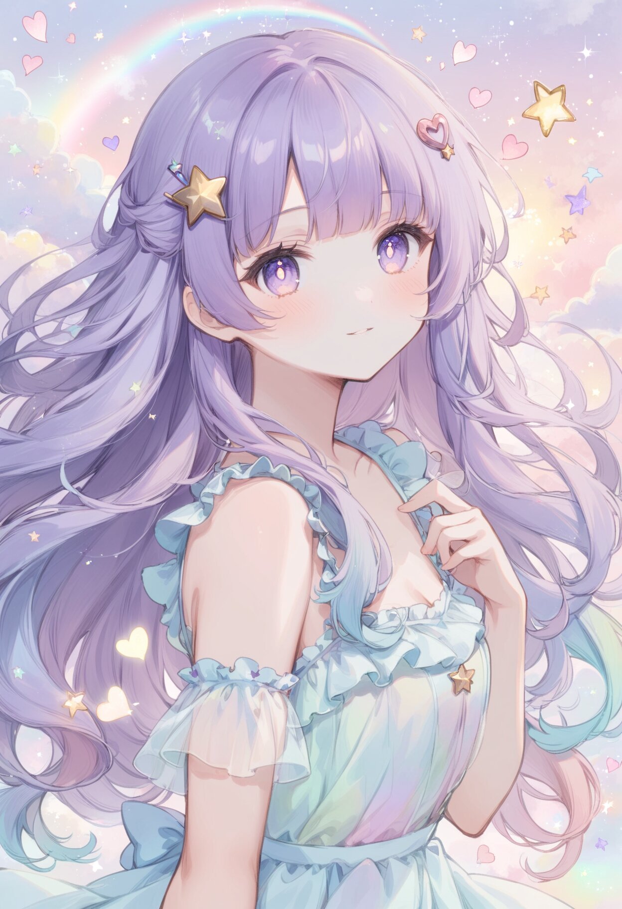 1girl, soft anime face, teenage, pastel purple hair, light blue inner hair, fluffy long hair, loosely wavy hair, soft flowing hair, straight-cut bangs, star-shaped hairpin, calm violet eyes, pastel color palette, soft glow, sparkles, floating petals, fluffy textures, star motifs, heart motifs, translucent fabric, soft frills, magical atmosphere, gentle light, dreamy background, faint clouds, cute accessories, subtle rainbow tones, masterpiece, best quality, soft pastel color palette, thin delicate lineart, pale colors, watercolor texture, matte finish, subtle shading, minimal contrast,