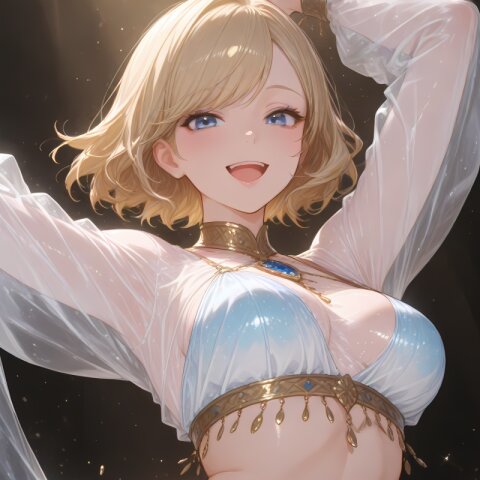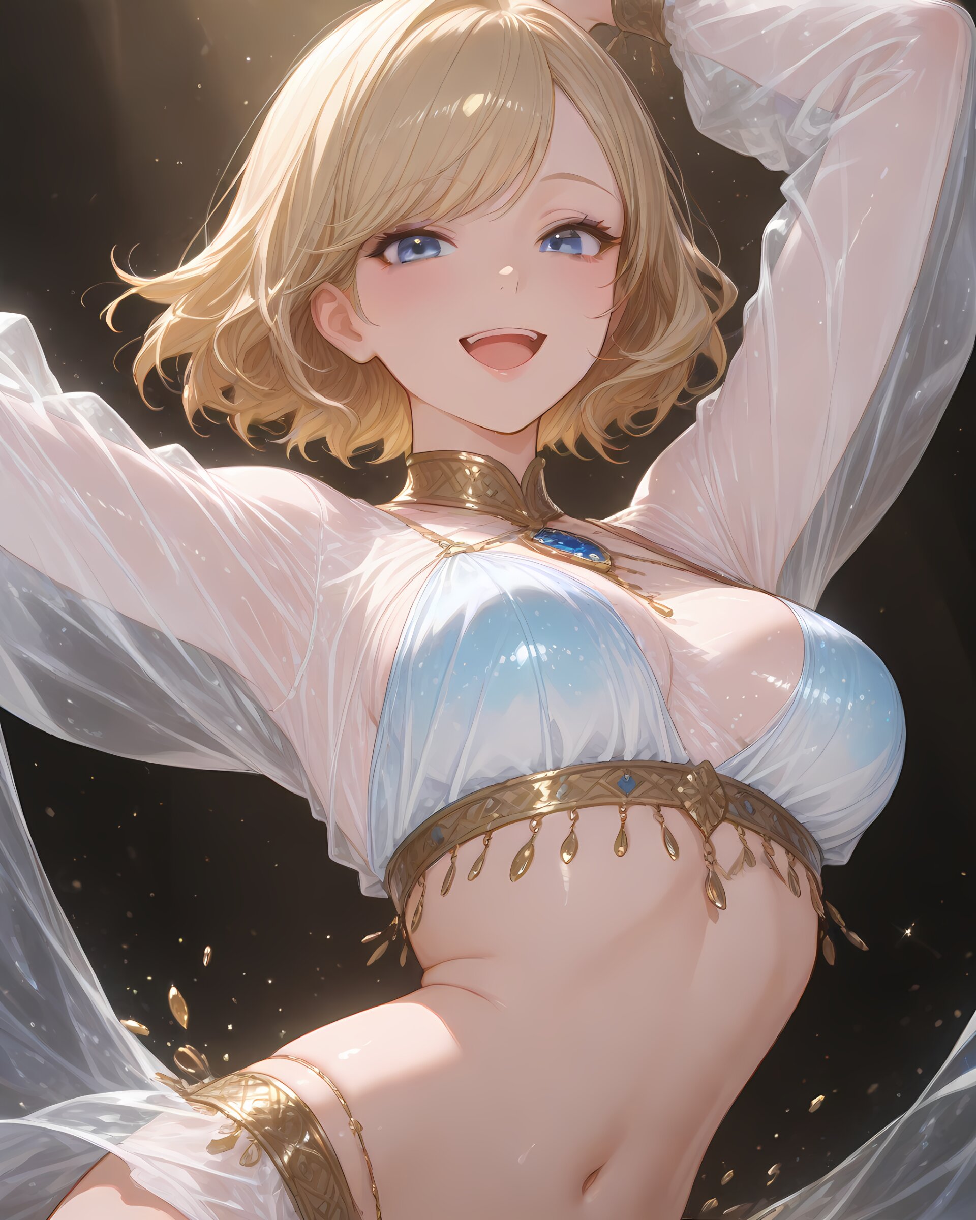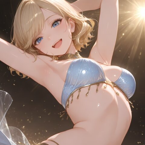 <lora:hyper_sdxl_8_step_lora_f16:1>,, 1girl, dancing, sexy pose, indoor, spot light, focus face, close up, BREAK 18 years old, girl, short hair, wavy blonde hair, swept bangs, medium breasts, slender, frosty blue eyes, sexy, belly dance clothes, smile, happy, open mouth, BREAK masterpiece, amazing quality, best quality, very aesthetic, ultra-detailed, 8K,