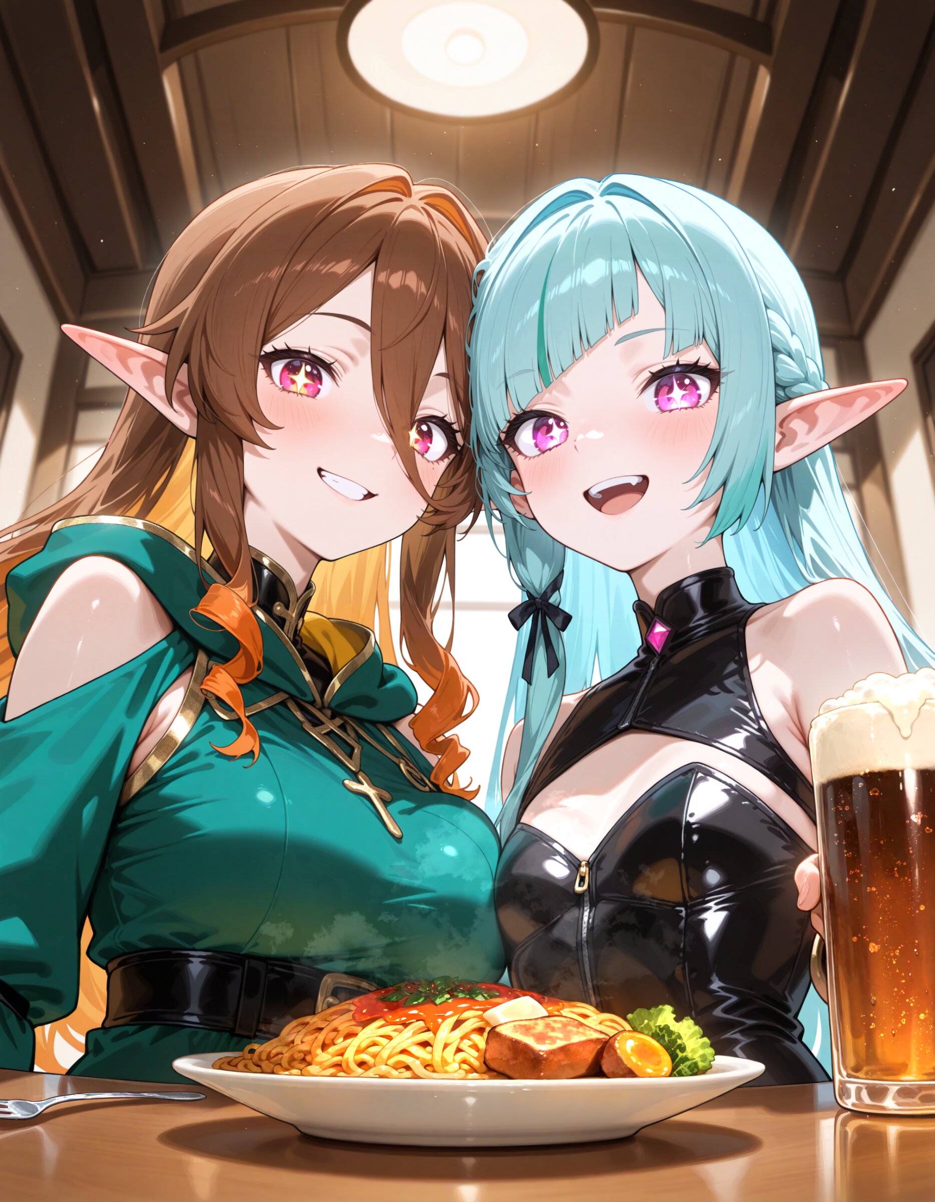 multiple girls, 4girls, (elf girls:1.2), , having a drinking party at a restaurant. (An overwhelming sense of openness (overwhelming openness:1.0) The glass exterior is stunning (glass:1.0) (stunning:1.0) A modern design with a sharp impression (modern:1.0) (sharp:1.0) The space is turquoise green-based and sophisticated (turquoise green-based:1.0) (sophisticated:1.0) Spacious interiors where one can feel a different flow of time from the everyday (spacious:1.0) (a different flow of time:1.0) Simple interior style, yet the finish is luxurious:1.0). Please show their joyous expressions and the sense of camaraderie between them,, (noon:1.0), soft natural sunlight, ((portrait:1.0), asymmetrical docking:1.1), , from below, Surveillance viewpoint, , perfect anatomy, , with chopsticks, spoon, , eating spaghetti carbonara on plate, sliced bread brown stew, , omelet on plate,, professional anime art lots of details, , overexposure, shiny-glistening, (watercolor style:0.7), (pastel color style:1.0) you can add scenery, (volumetric lighting), To make the background more distinctive. super fine concept art, hard surface, 8K, unreal engine, masterpiece, best quality, amazing quality, very aesthetic, absurdres, newest, ambient occlusion, raytracing, <lora:noline (1):-0.5> <lora:sdxl2-flat2-512b:0.2> <lora:facelightup_xl_v10:0.5> ((portrait:1.0), asymmetrical docking:1.1), , from below, Surveillance viewpoint cute elf girls sitting on cubic chair,(shiny skin:1.0), long hair, drill hair long bangs , soft hair, insanely beautiful hazel brown eyes, first-rate female bodies, perfect body, framed breasts, small hips, (embarrassed:0.5), (drunkard, happy:1.0), + +, round teeth, (toothy smile:1.0), (druid robes:1.2), nature-inspired accessories, oak-tree cane, sleeveless, looking at viewer, detached sleeves dynamic lighting, sunlighting, warm sunlight, (perfect anatomy:1.2), cute girls, extremely detailed, perfect face, perfect eyes, (depth of field),文字数制限により省略