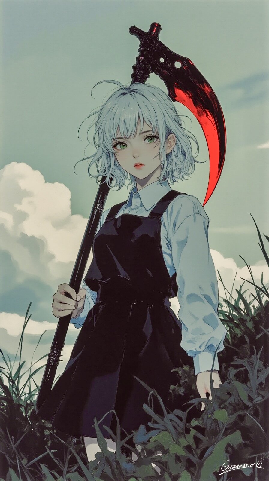白いシャツに黒のジャンパースカート、そして、肩に掲げた大鎌。