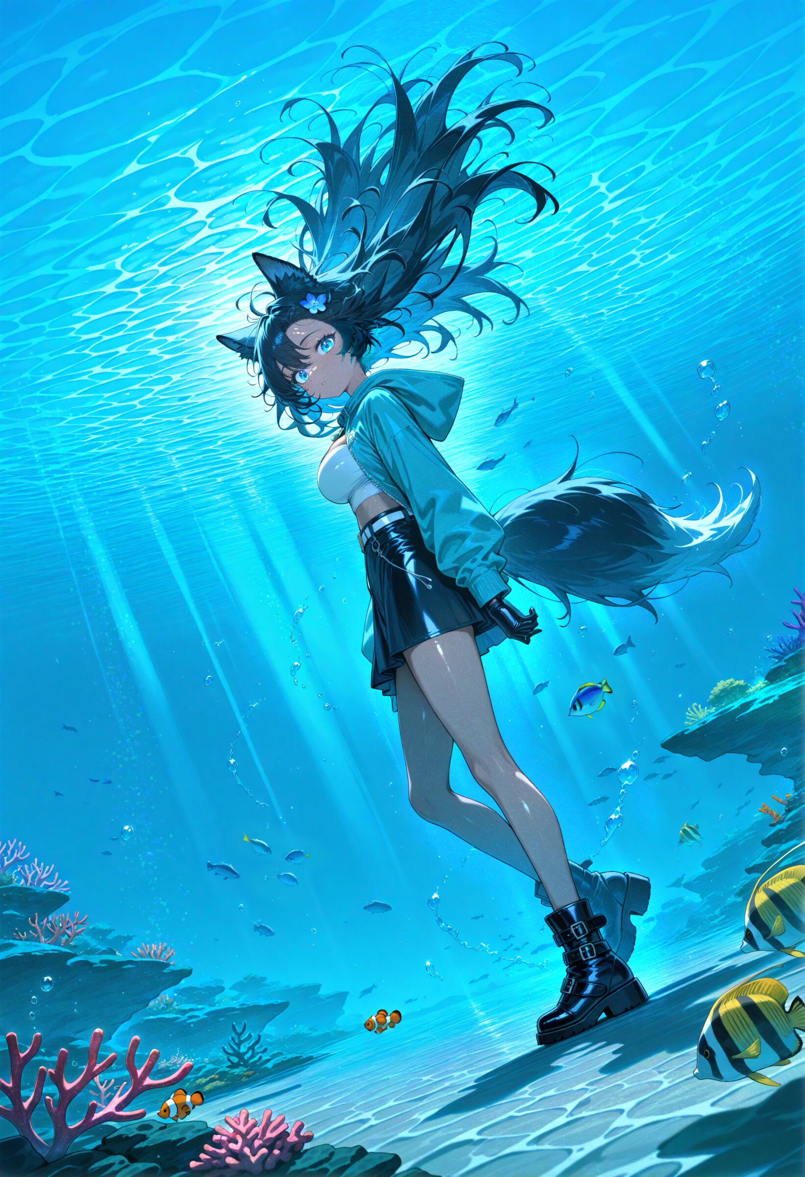 from side, looking at viewer wide shot from below, looking down, dutch angle, looking at viewer, surgeonfish, tropical fish, underwater, clownfish, butterflyfish, coral, seaweed, bubble, floating hair 1girl, black wolf ears, dark skin, young beautiful girl, large breasts, tall, wolf tail, (aristocratic features), (Black Hair:1.2) (disheveled long hair over ears:1.3) messy hair ornament flower, (perfect turquoise eyes:1.3) long eyelashes,, wearing turquoise hood down and white tube top leather gloves, lether miniskirt, belt boots, turquoise hoodie, water magic, , walking, butterfly sitting dim lighting, super fine concept art, hard surface, 8K, unreal engine, masterpiece, best quality, amazing quality, very aesthetic, absurdres you can add scenery, (volumetric lighting), To make the background more distinctive. professional art lots of details, , overexposure, shiny-glistening, (watercolor style:0.0), (pastel color style:0.0) <lora:noline (1):-0.5> <lora:sdxl2-flat2-512b:-1.0> <lora:facelightup_xl_v10:0.5>