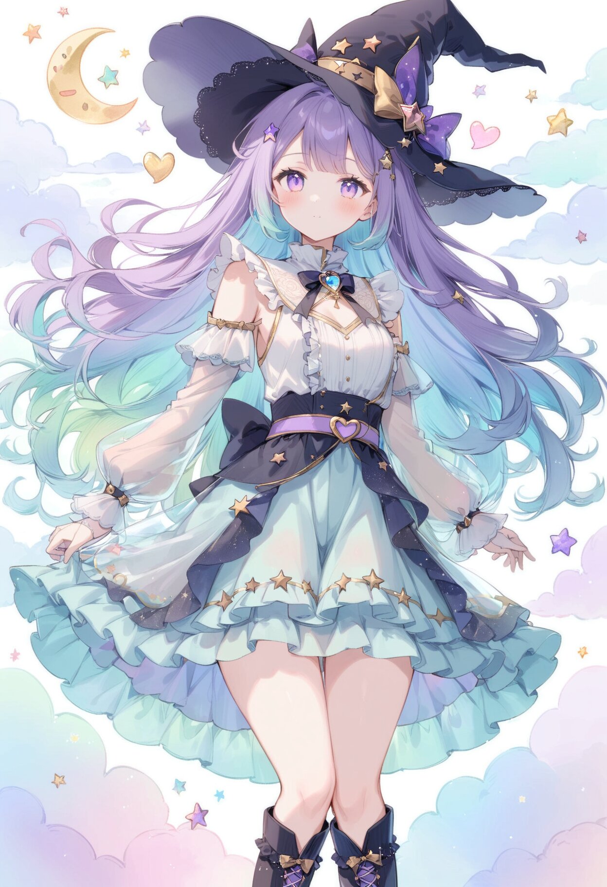 1girl, soft anime face, teenage, pastel purple hair, light blue inner hair, fluffy long hair, loosely wavy hair, soft flowing hair, straight-cut bangs, star-shaped hairpin, calm violet eyes, pastel color palette, soft glow, sparkles, floating petals, fluffy textures, star motifs, heart motifs, translucent fabric, soft frills, magical atmosphere, gentle light, dreamy background, faint clouds, cute accessories, subtle rainbow tones, masterpiece, best quality, soft pastel color palette, thin delicate lineart, pale colors, watercolor texture, matte finish, subtle shading, minimal contrast, cute fantasy witch outfit, dreamy pastel colors, soft flowing fabric, elegant long-sleeved dress with layered skirt, translucent puff sleeves, lace-trimmed hems, soft ruffles, star and moon embroidery, glowing accents, satin ribbon belt with a gemstone in the center, high collar with frilled edges, delicate gloves, fluffy shoulder cape with gold trim, knee-high pastel boots with ribbon laces, oversized classic witch hat with wide brim, tilted slightly, decorated with star-shaped pins and a flowing ribbon