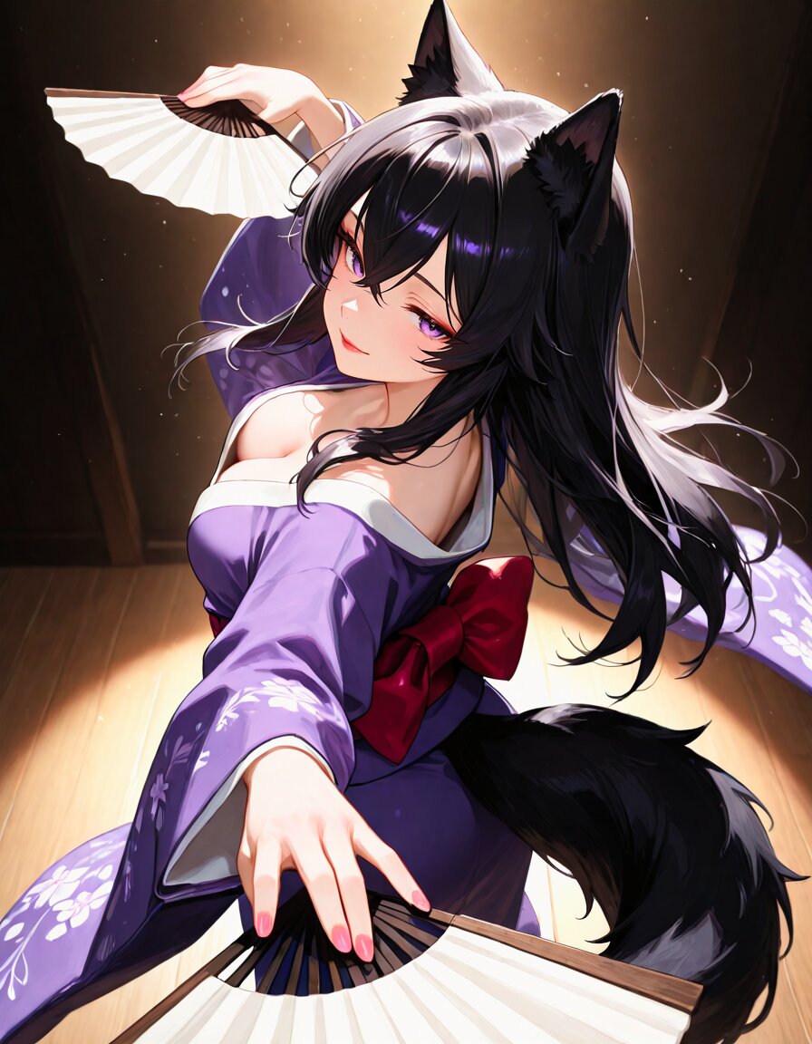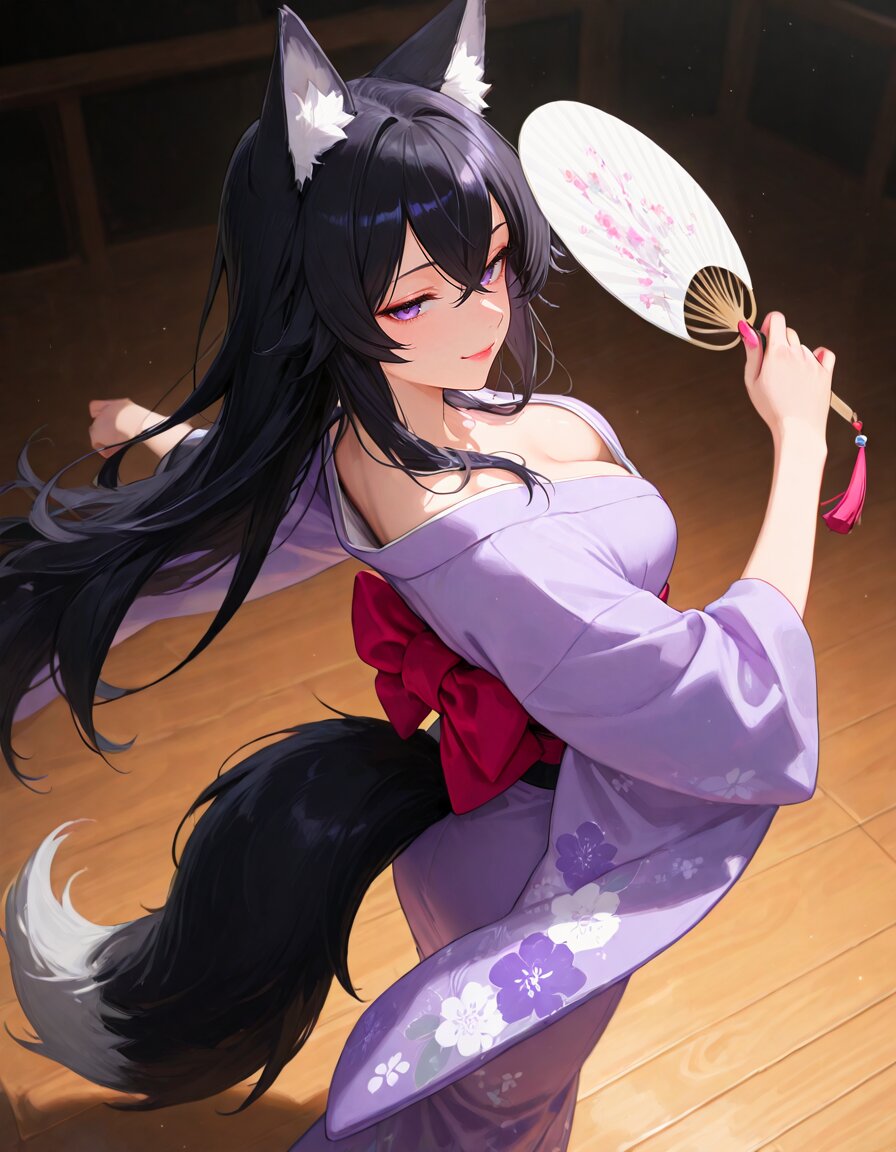 1girl,<玲さん>, half-closed eyes,gentle smile, purple kimono,holding japanese fan,paper_fan,dancing, from above,from behind,facing to the side,looking at viewer,dancing, general,safe,, appropriate posture,appropriate configuration,ideal ratio body proportions,perfect anatomy, <lora:Fixhands_anime_bdsqlsz_V1:1>, masterpiece,best quality,newest,absurdres,highres,ultra high res,8K UHD,hyper-detailed,